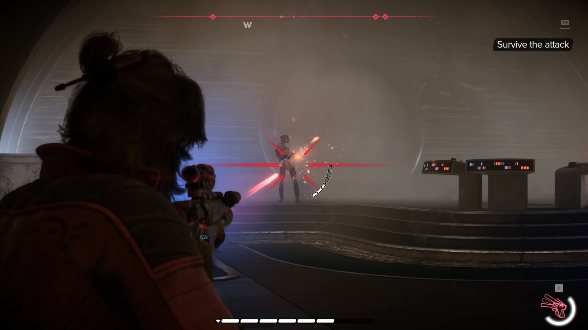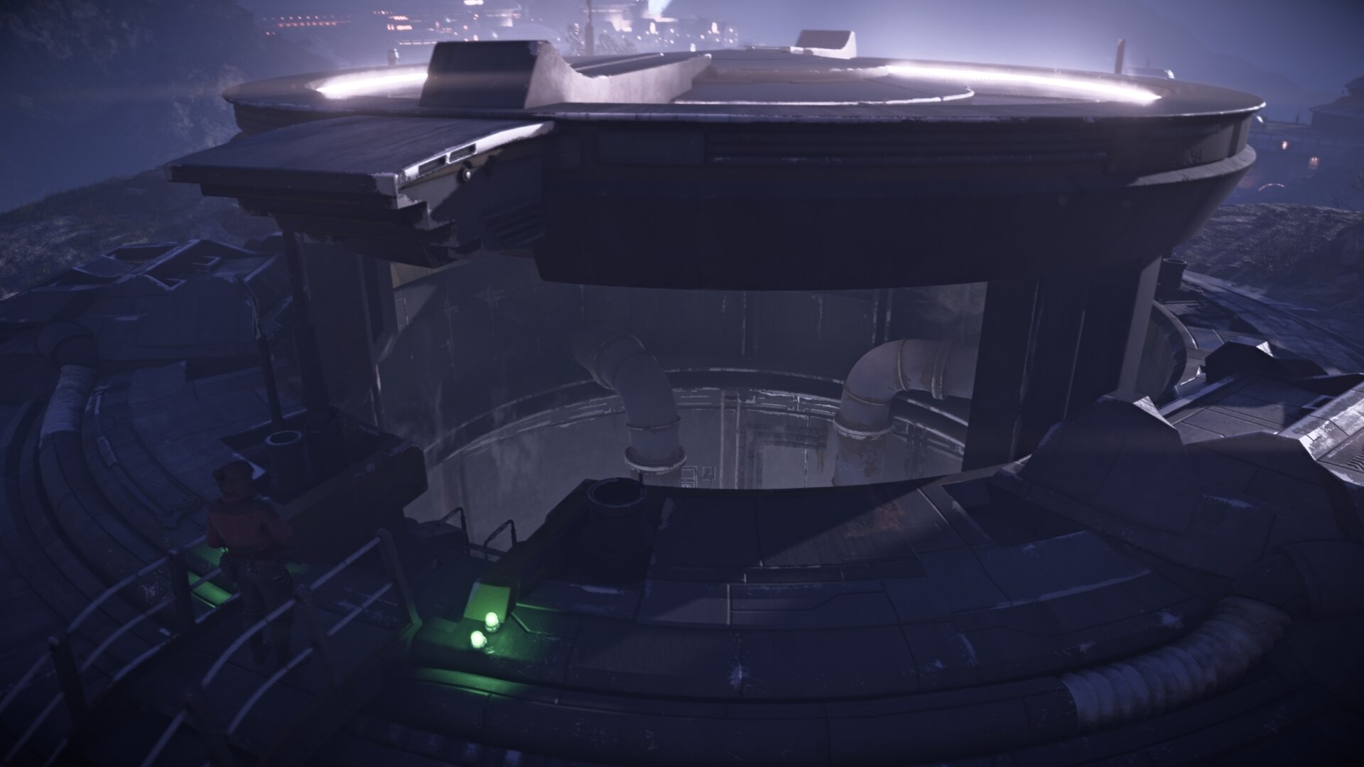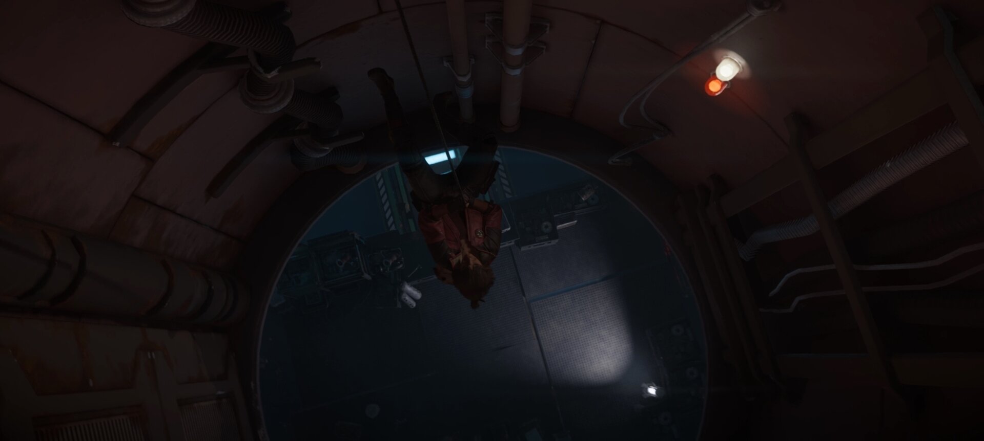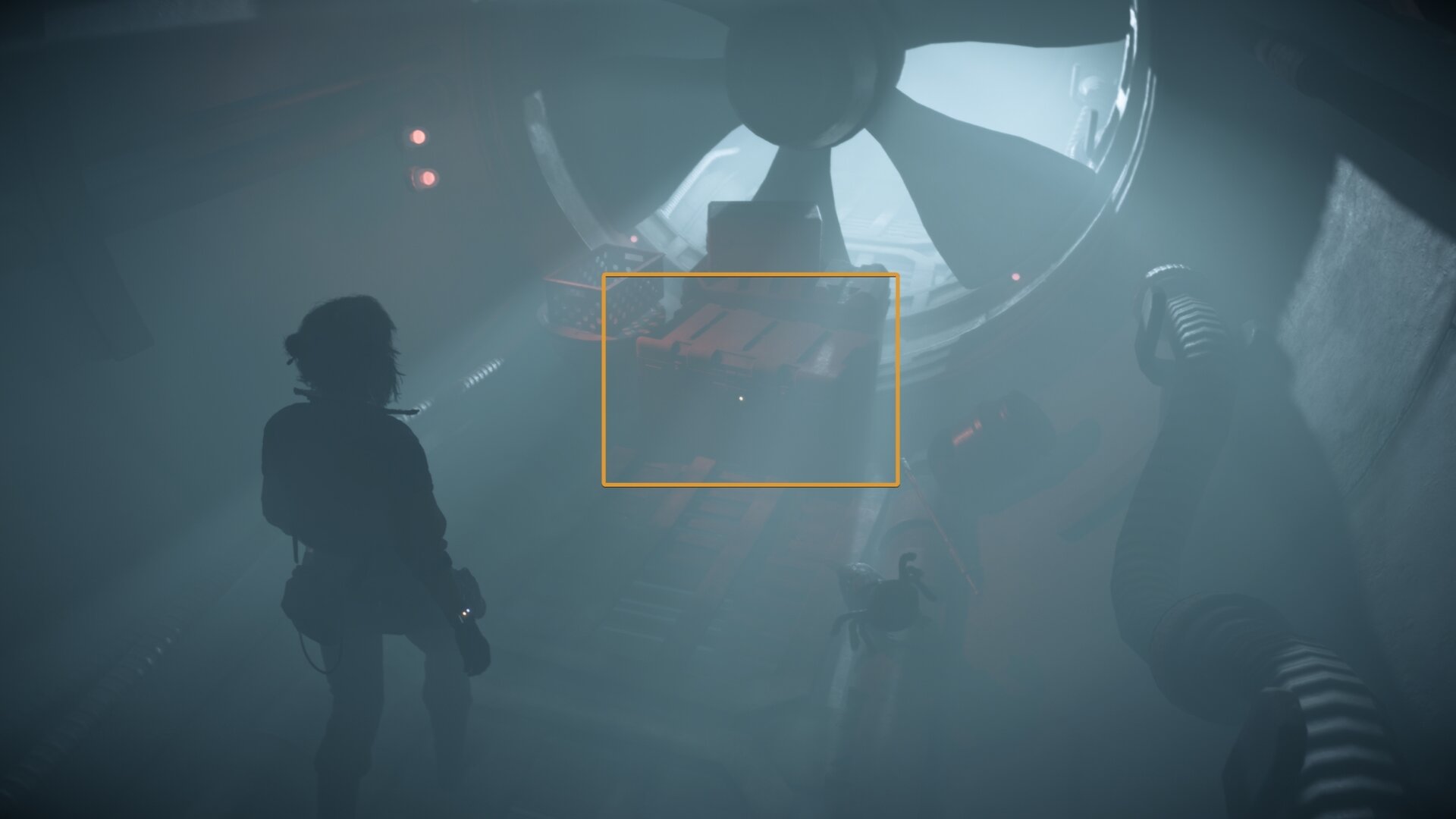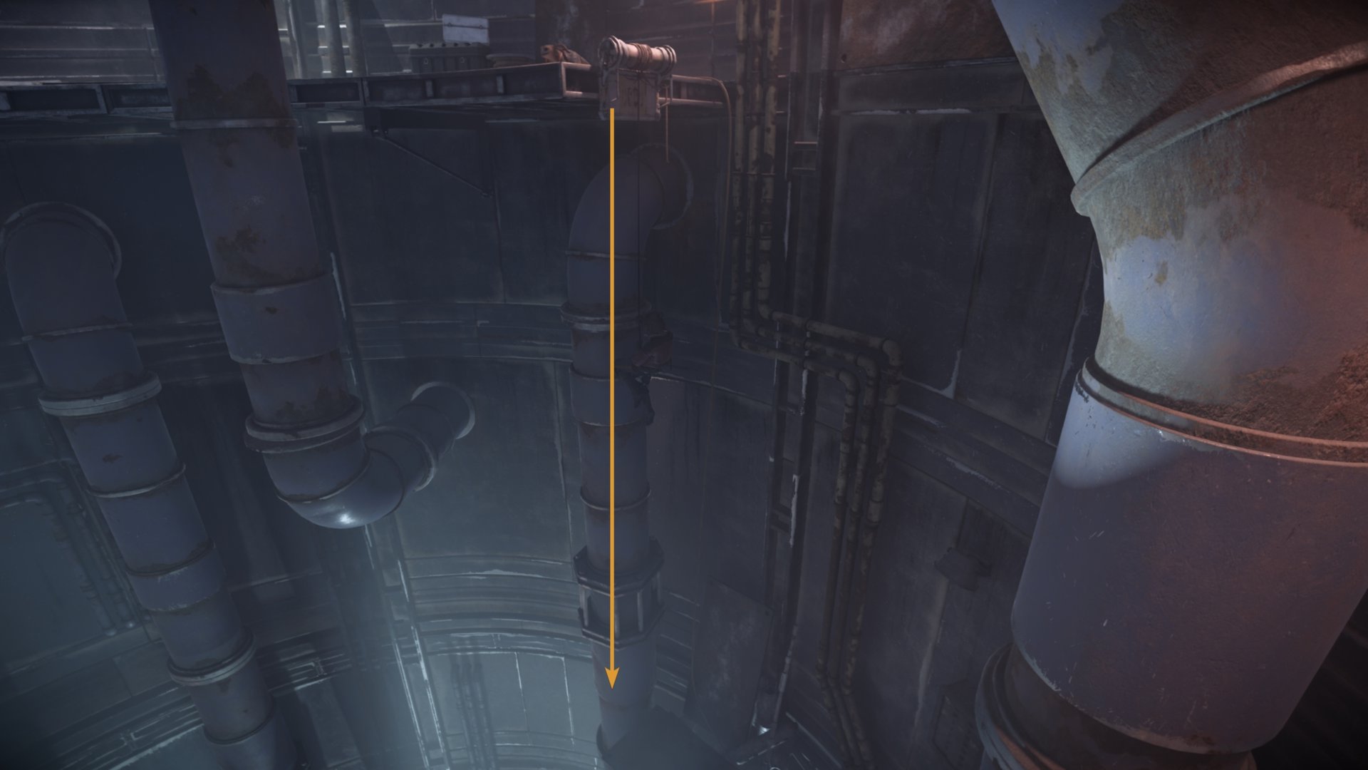 If you make a right and then a left, you’ll find a room with a small chest and a vent that leads to the exit. Use the grapple point to rappel down into the hangar bay.