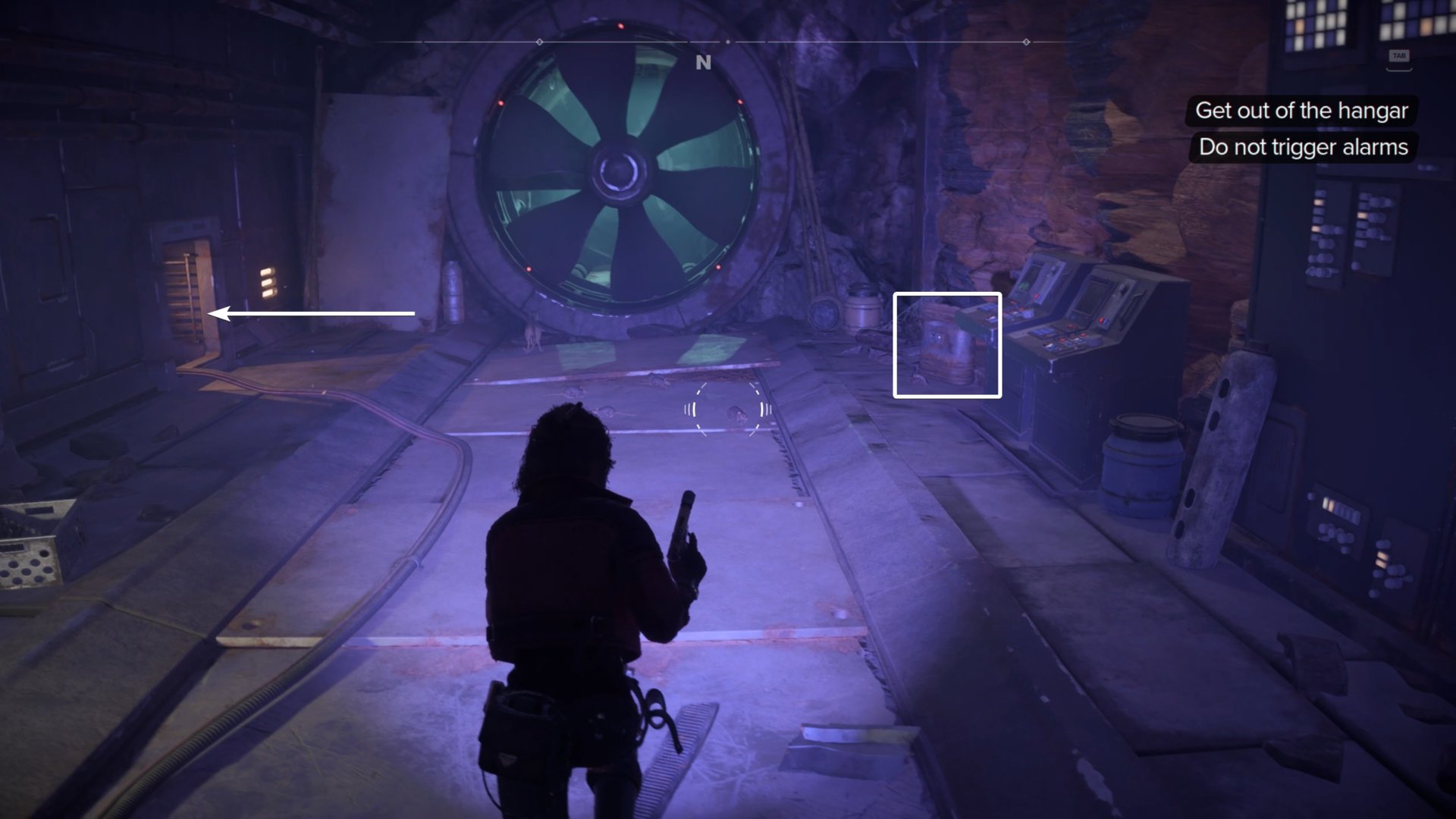 The southern half of the hangar bay will grant access to some computers that allow you to open the doors on the upper levels and turn off security cameras to get by.