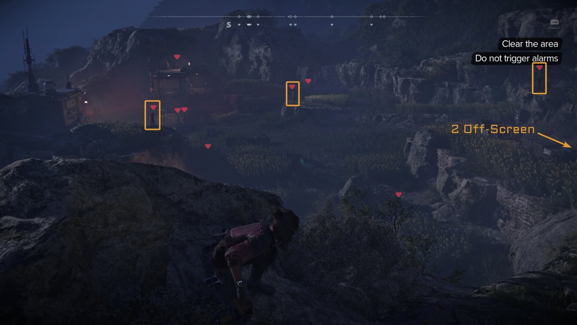 These guards have a large detection radius, so be extra sneaky and use the tall grass for cover. Mark your targets with your binoculars and be sure to take down the snipers to make sneaking through the area easier.