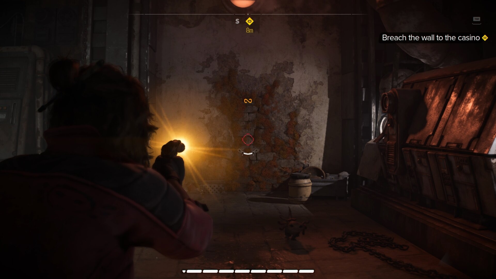 Follow Riko and Gedeek upstairs and look for a wall you can blow up with your power blaster. Once the wall is down, you’ll access the casino and reunite with Asara.