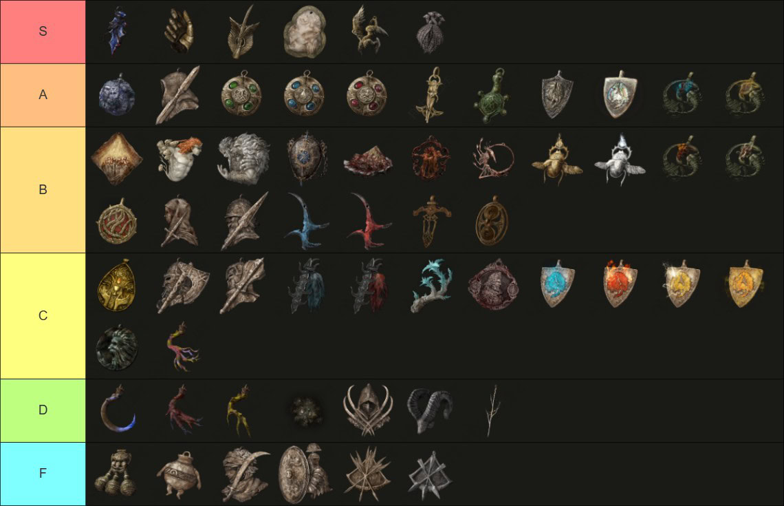 Below, you’ll find the tier lists for talismans and spells. Keep in mind that these are just default lists. Your mileage will vary depending on Relic selection.