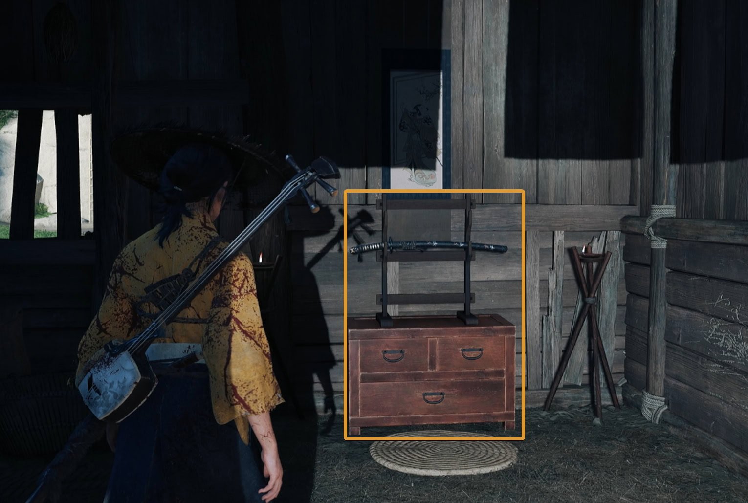 Walk around the house to find the entrance and investigate the katana on display. This will start a cutscene where Atsu meets Hanbei.