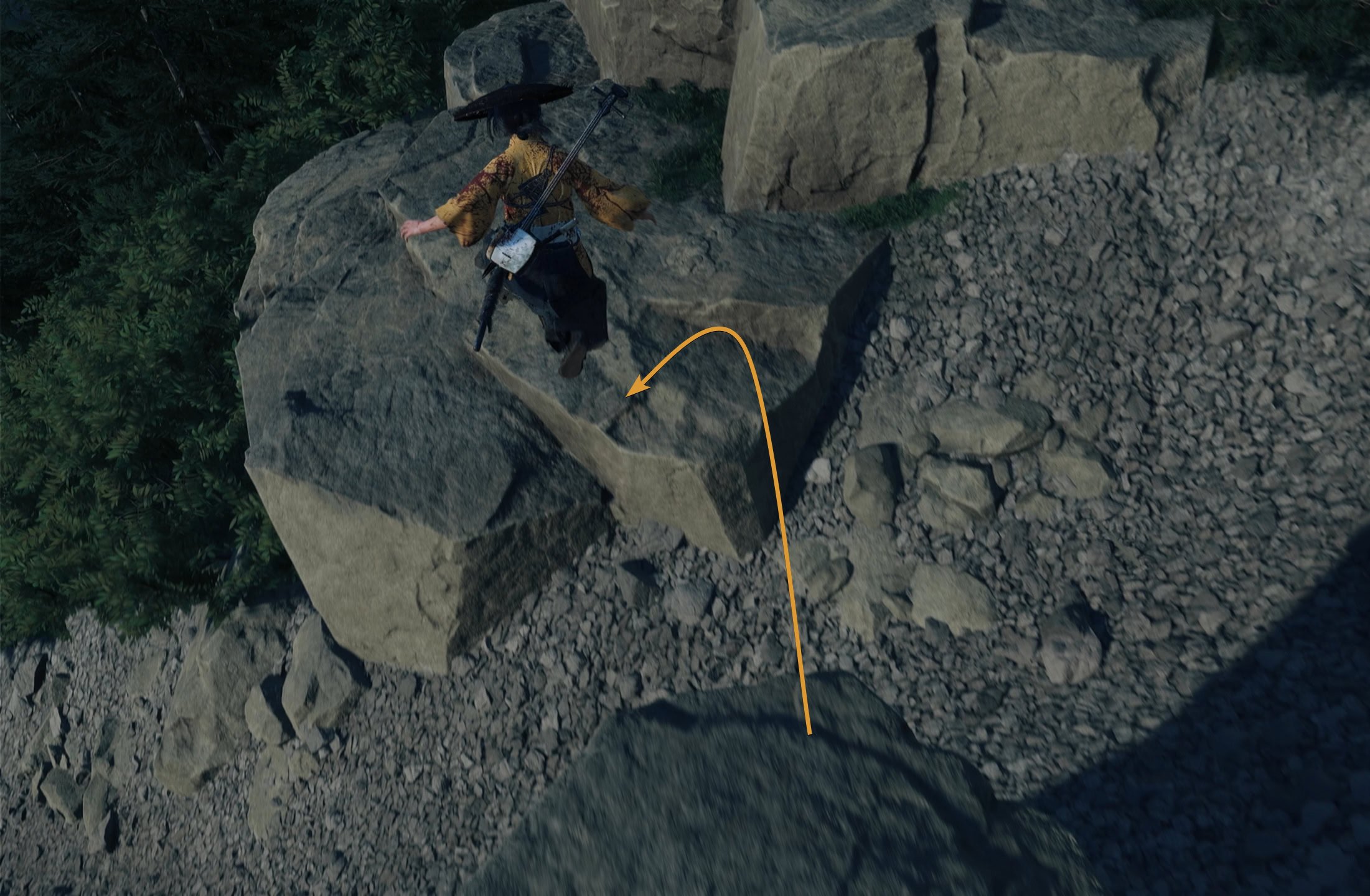 As you climb up the mountain, you’ll reach a dead end near a tree next to a gravel slope. To proceed, jump down to the rocky outcrop below.