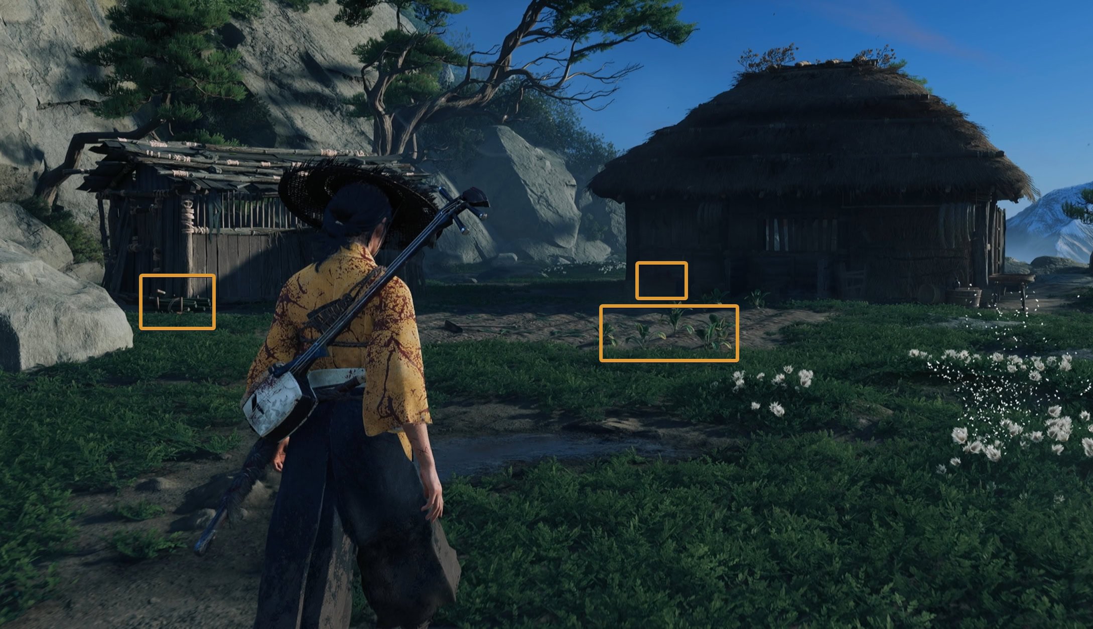 From there you can continue climbing the mountain on the other side until you find Hanbei’s House. Investigate the area by interacting with the crops, bamboo pile, and toolbox as pointed out below:
