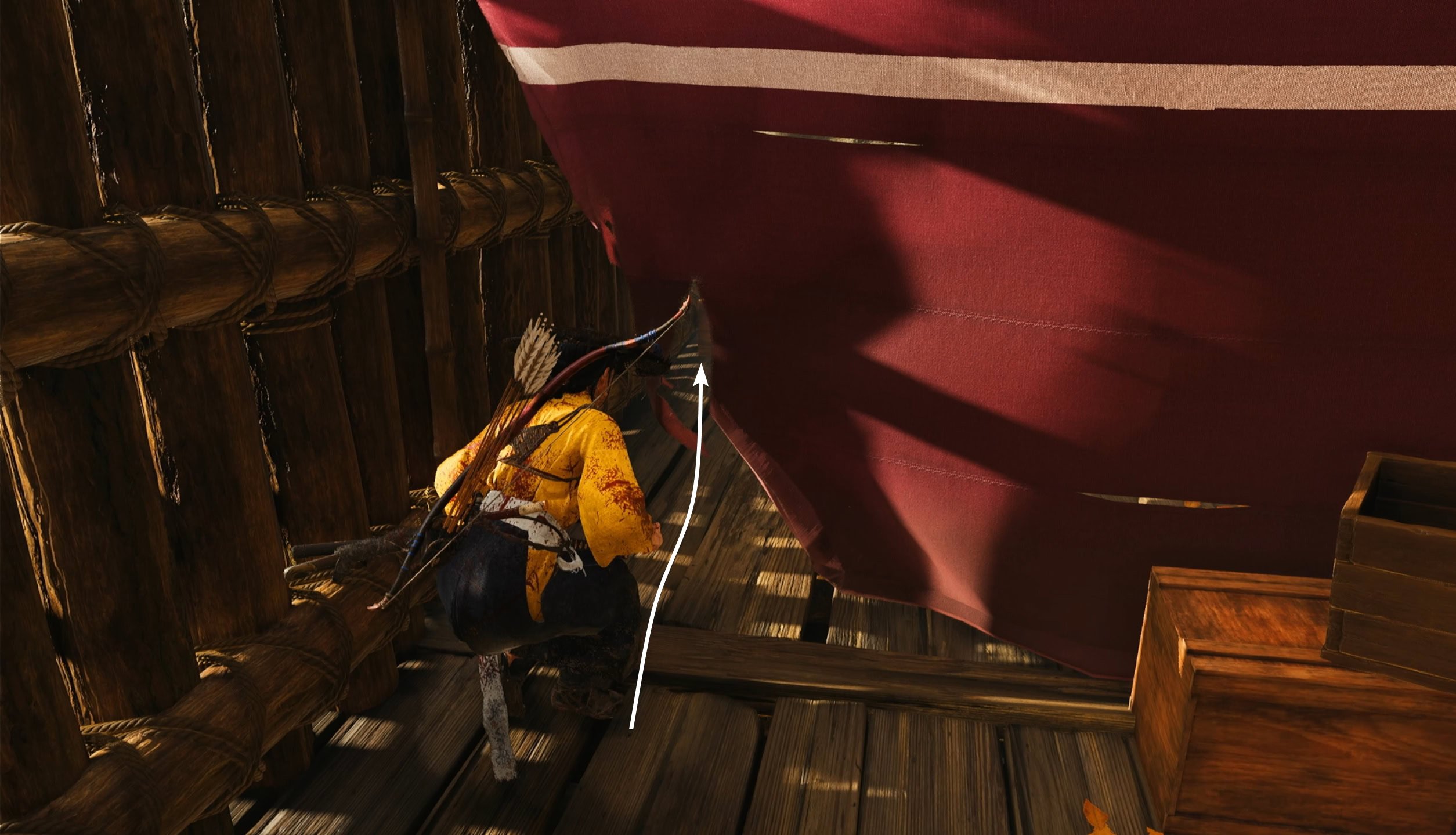 Assassinate the outlaw overlooking the ravine and continue sticking to the left, hiding in the yellow grass when available. Step through the cloth panel to find a ladder straight ahead. Go up the ladder and continue sticking to the left side.