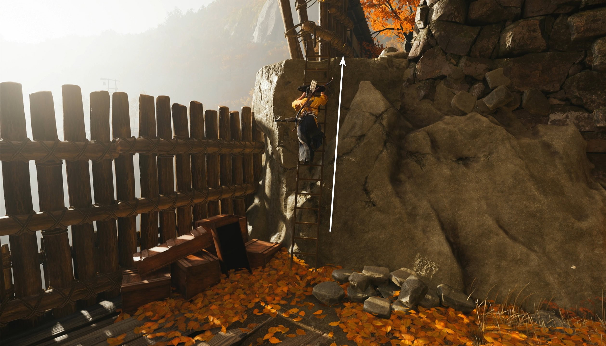 Squeeze through the gate then make a left. You’ll want to go up the outcrops then jump to the scaffolding on the wall to reach the next area.