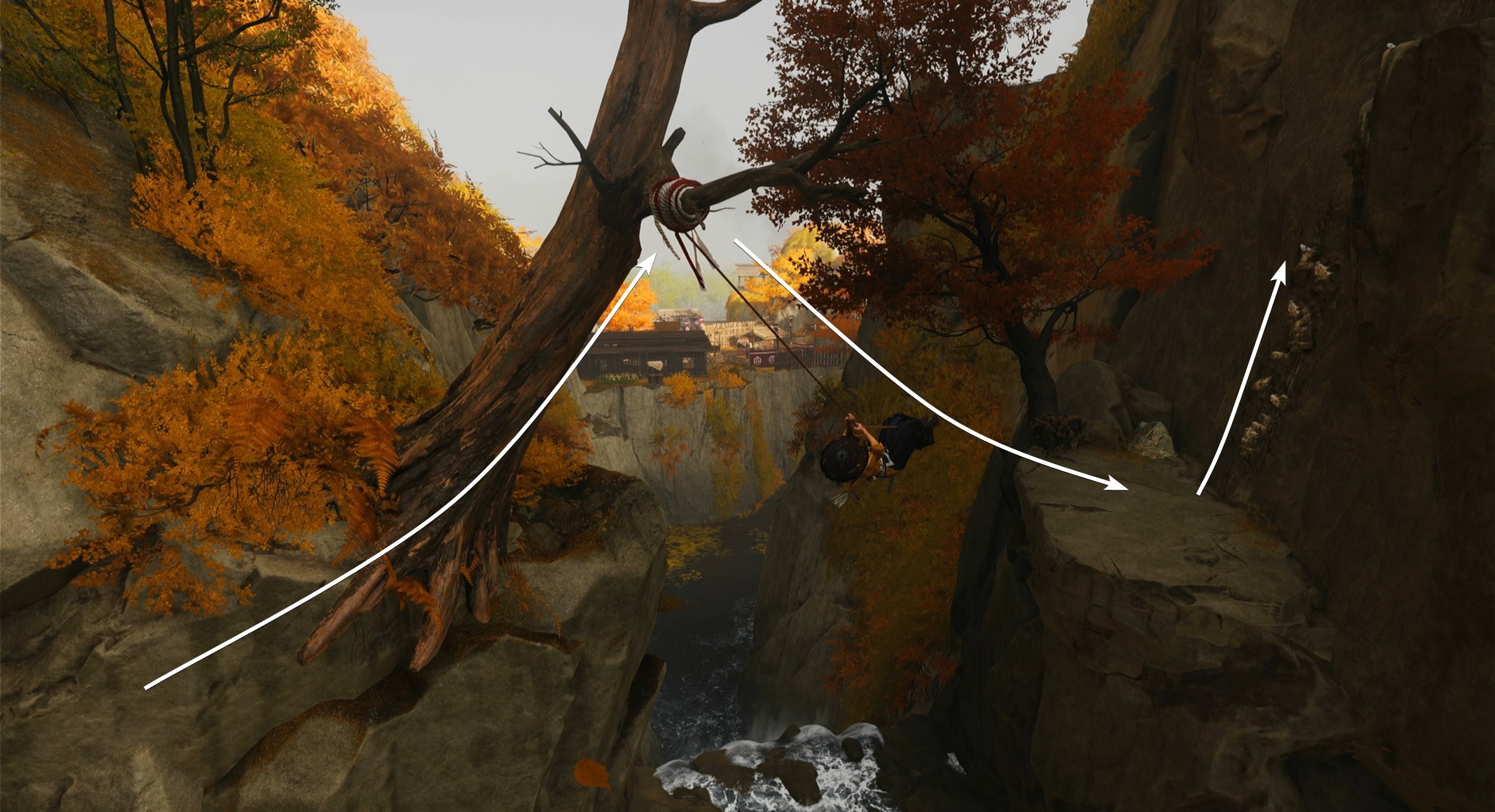 You’ll need to jump across the ravine to reach the opposite cliff face, then climb up the rocks with the white markings. Once you reach the large tree, jump towards the other cliff and press △ to grapple to the branch ahead.