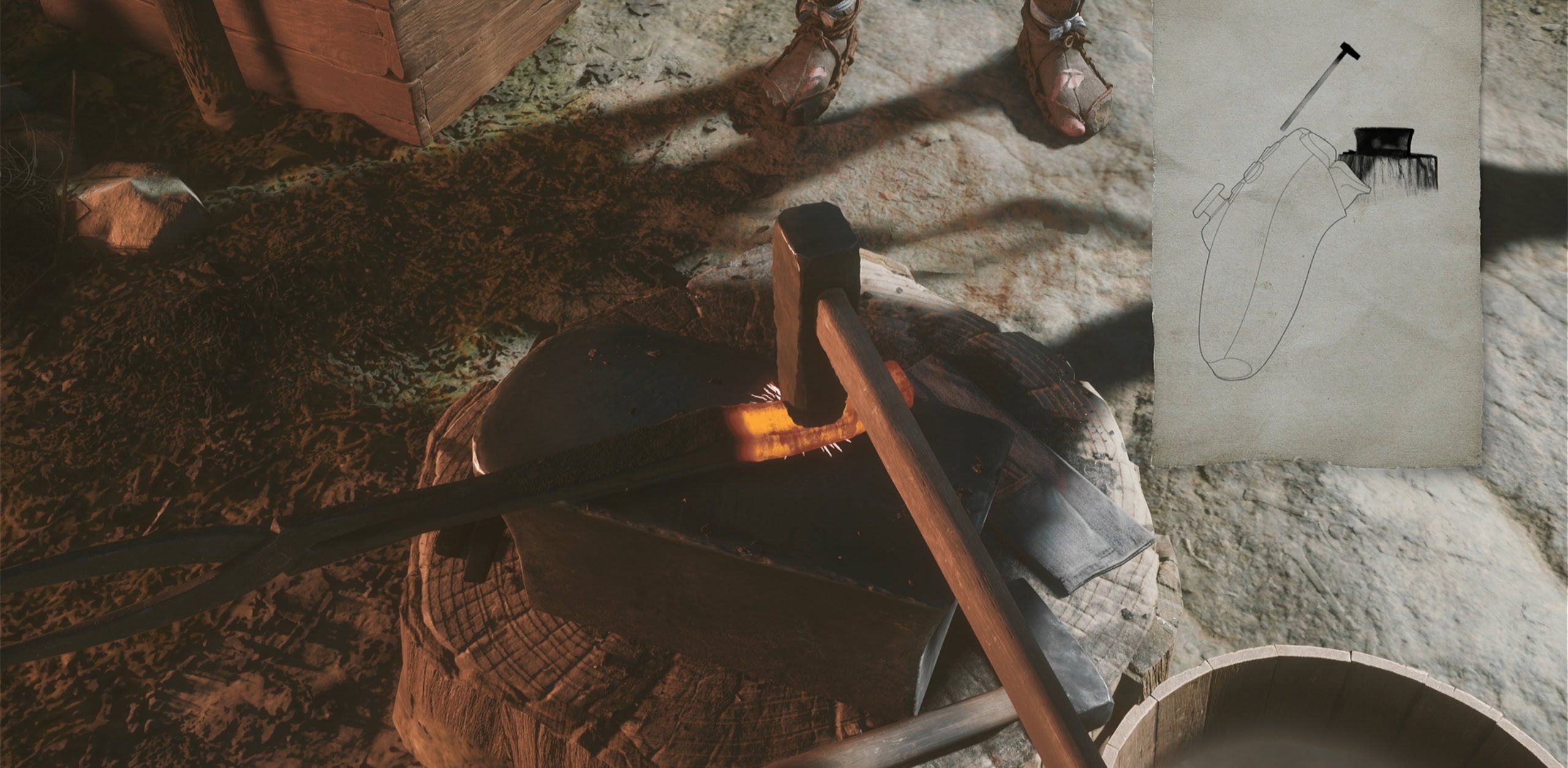 You’ll forge your weapon through a memory sequence like the first time you came back home. Tilt the controller to hammer the metal, use ⭘ to flip the metal, and ☐ to reheat the metal.