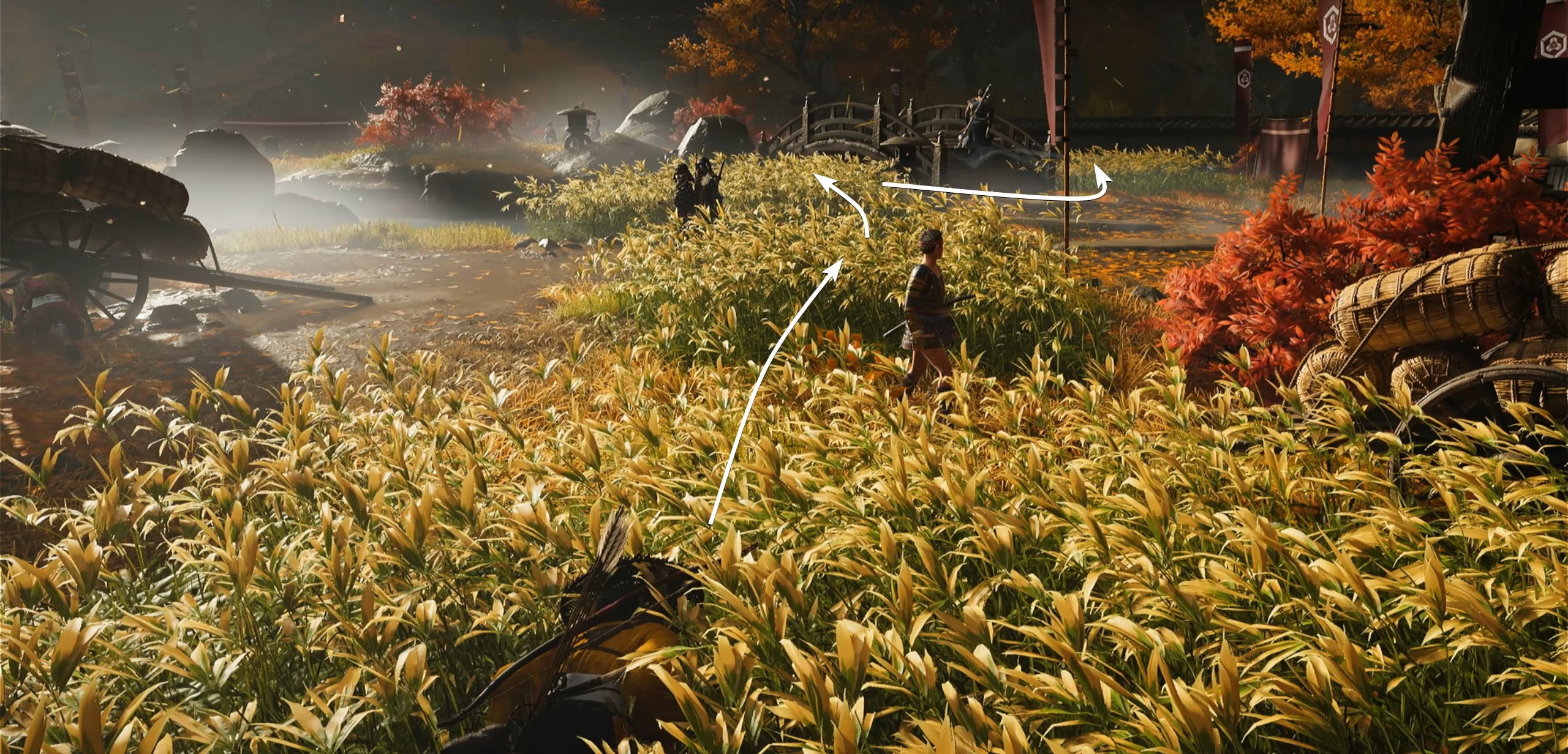 After dealing with the outlaw that recognized you, you’ll need to sneak your way through the first part of the fortress by hiding within the yellow grass. Follow the grass and stick to the right to get behind the stables ahead.