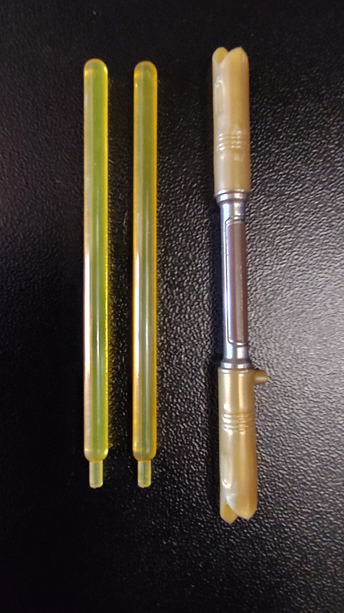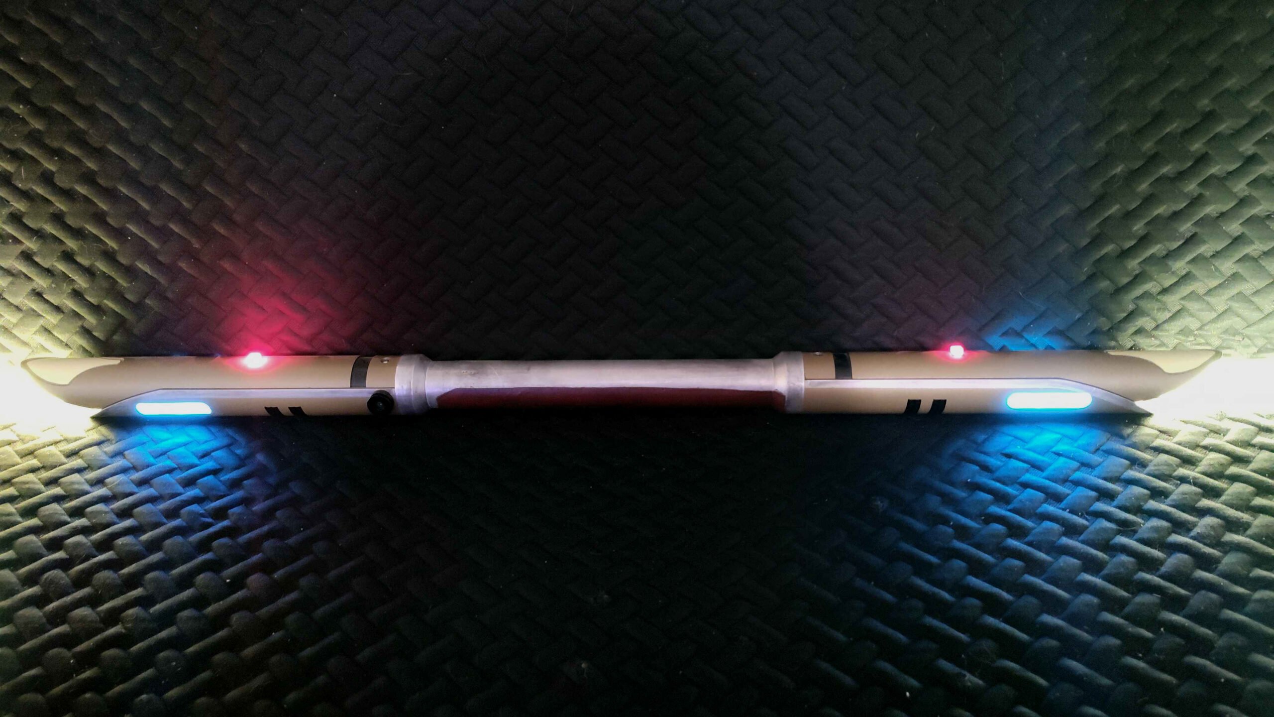 The Jedi Temple Guard Pike comes with two blades about the same length as the hilt. The blades are detachable so you could pose them with only a single blade activated if you so desired.