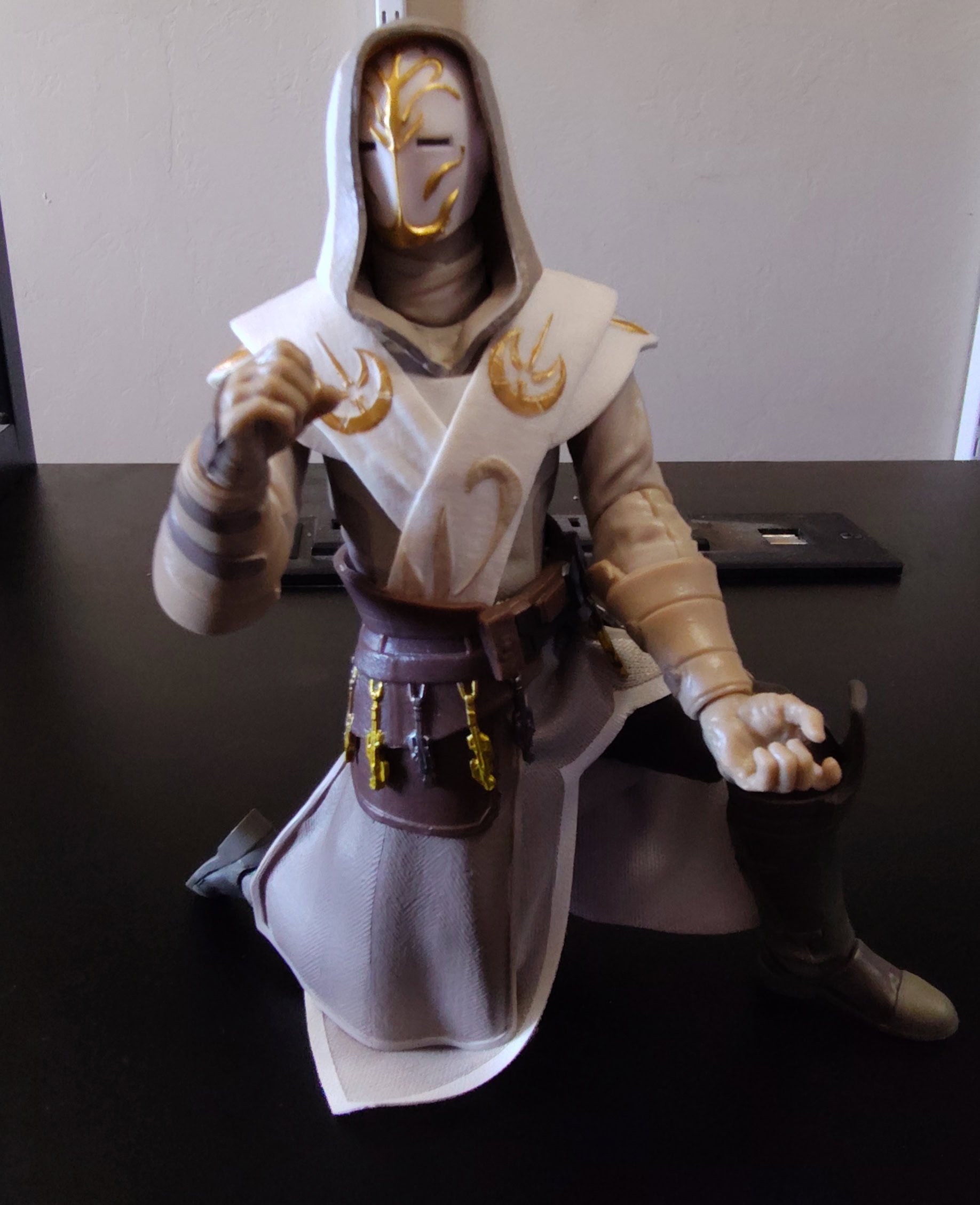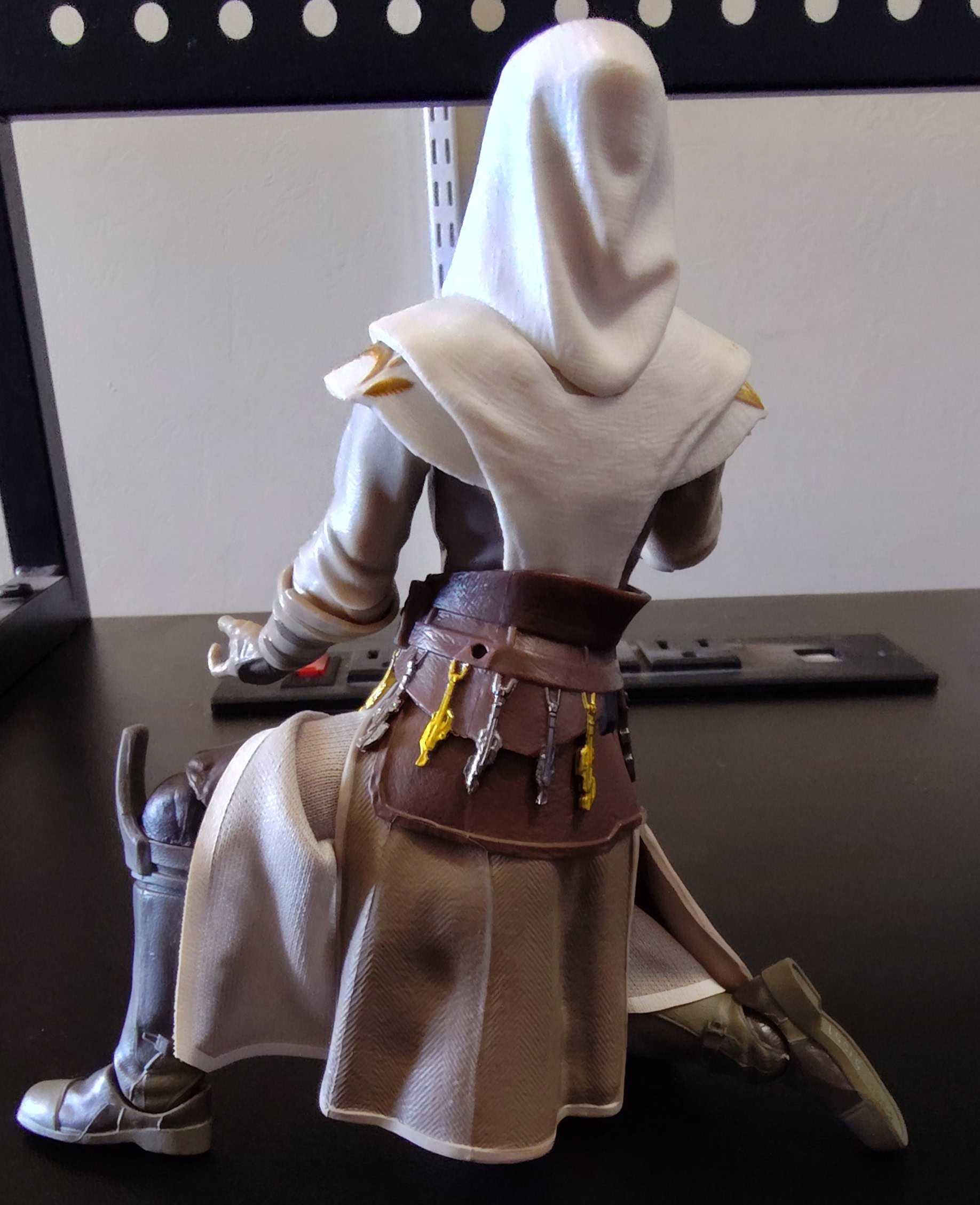 The hood, tabards, and skirt are made of a thick yet slightly pliable plastic. This is particularly useful on the skit as it allows the legs to be posed more easily.