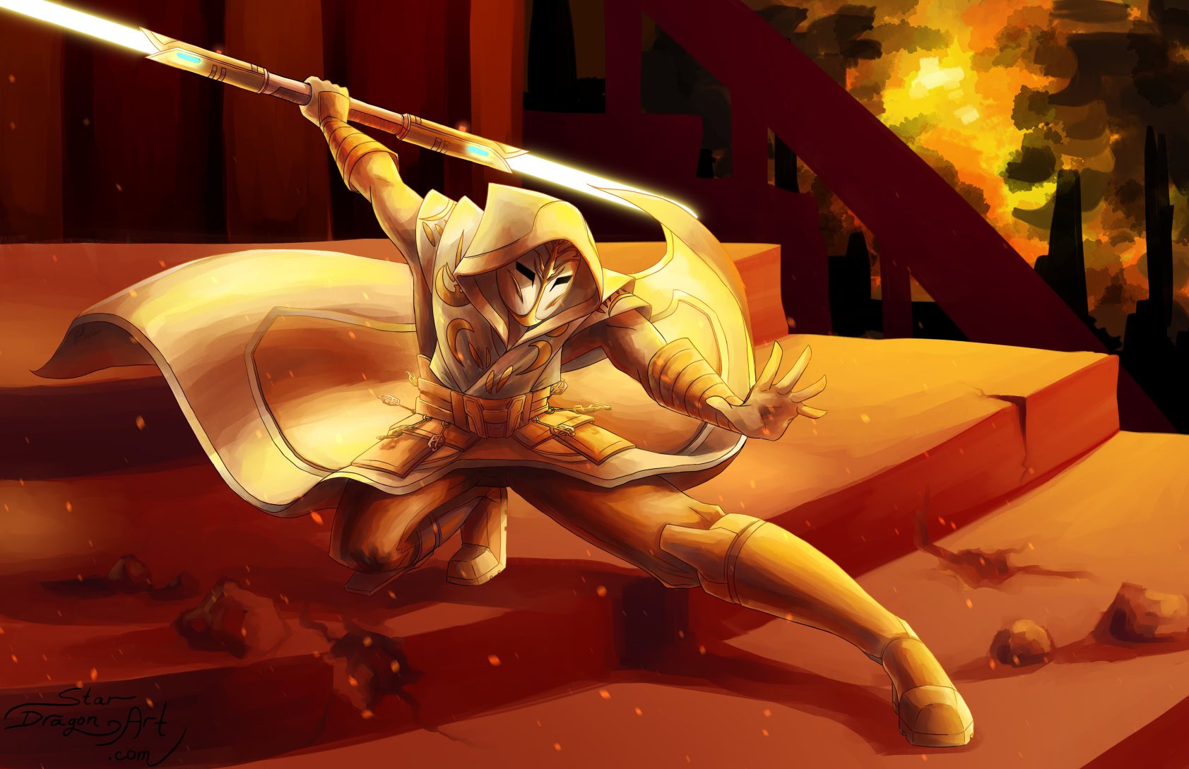 One of the first details you’re likely to notice is the brilliant gold on the mask, tabards, and pauldrons of the Temple Guard. The neck features the long neck of the tunic and a neck sleeve beneath that. This would help the Temple Guard retain anonymity.