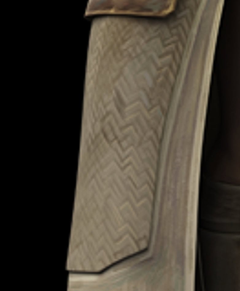 There should also be a bare metal trim at the edge of the lower shroud of the pike. The wheel clip is replaced by a peg that allows the Temple Guard to hold the pike on the left side of their waist.