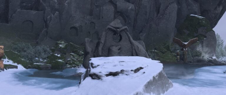 When the raiders are killed, help Jubei investigate the bodies of other Oni Raiders. After the cutscene, pull out your spyglass and zoom in on the log at the top of the cliff. Surprise! It’s Mad Goro taking a shot at you!