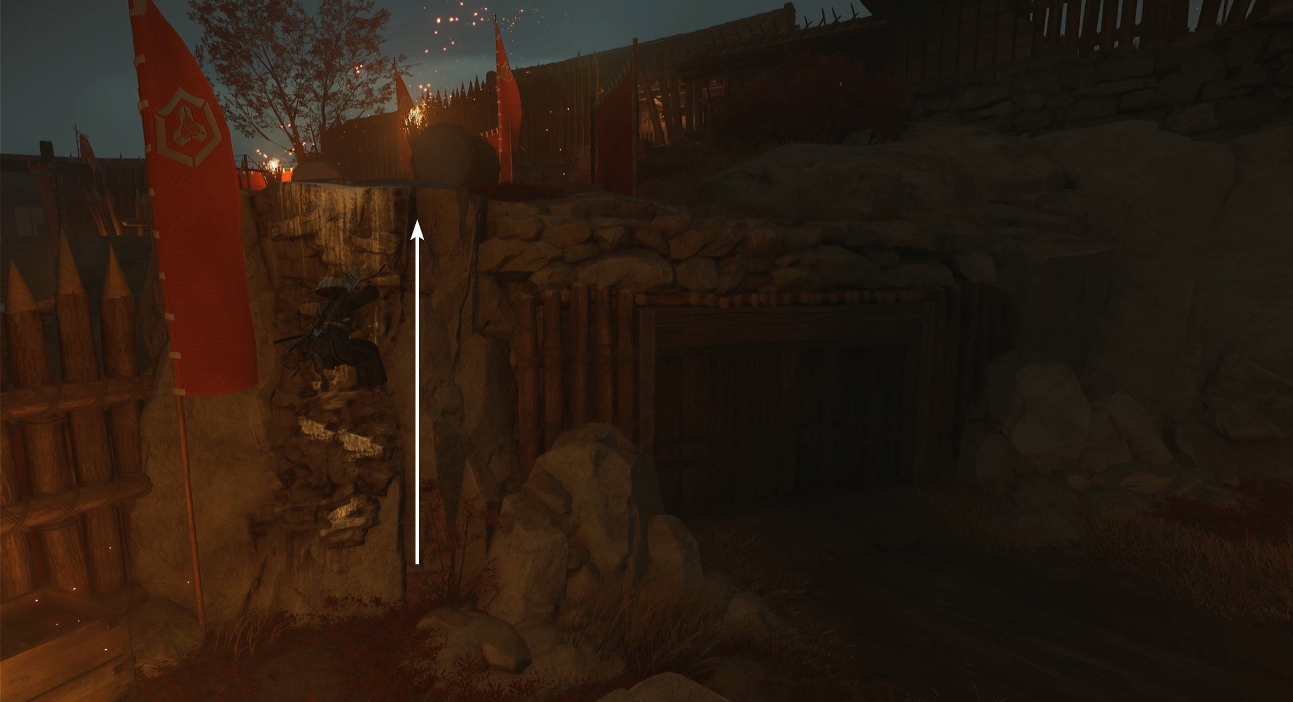 This next area has several raiders with two samurai slaves. Assassinate the raiders and one of the samurai will tell you the holding cells are up the ledge. Behind him is a rocky wall you can climb up.