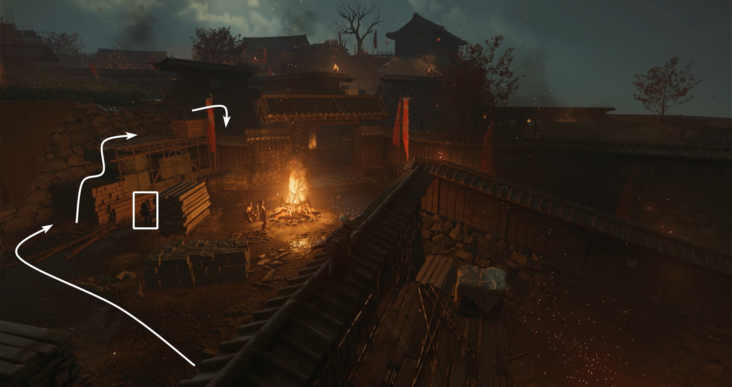 Hide in the yellow grass and look for a patrolling raider. When he turns his back and walks towards the bonfire, follow him. To your right will be some stables. Go behind the stables and climb up.