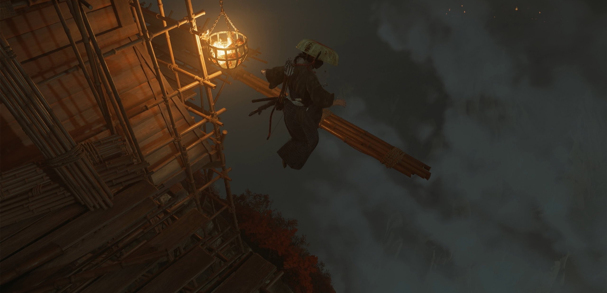 Open the purple chest for some Oni Raider masks, then climb up the scaffolding with Jubei. When you reach a dead end, you’ll need to jump onto the suspended bamboo.