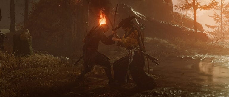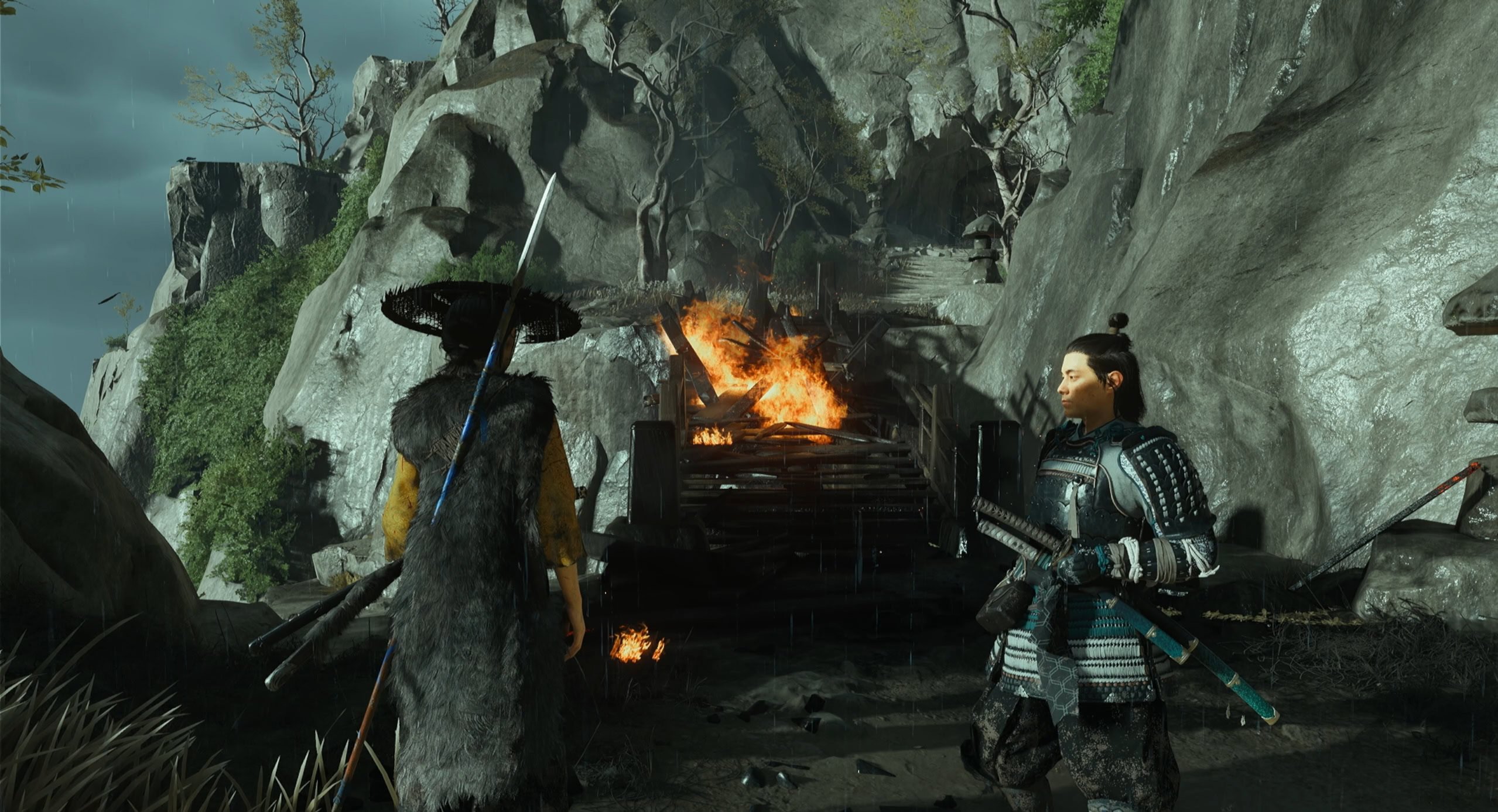 You’ll reach a camp full of bounty hunters. Defeat them, loot the chests in the area, then follow Jubei to the burned bridge.