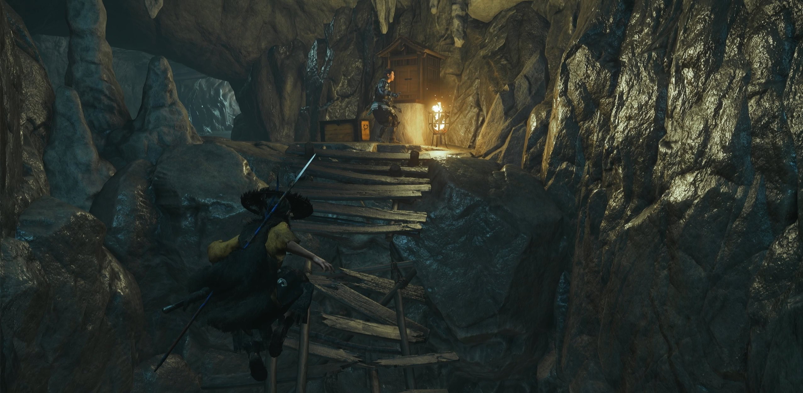 Grapple onto the loose part of the bridge and pull it off to clear the way for Jubei. Go into the cave ahead to start your way to the shrine.