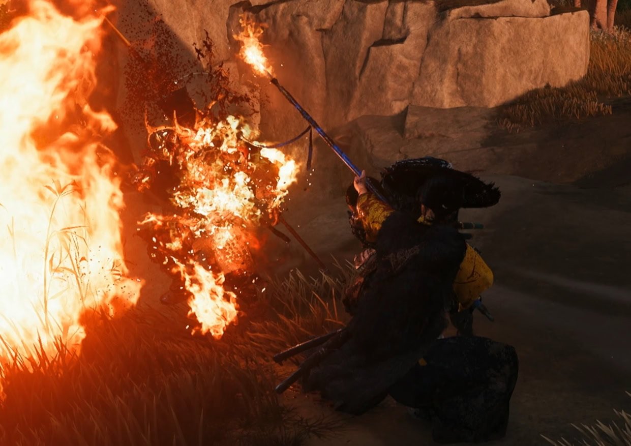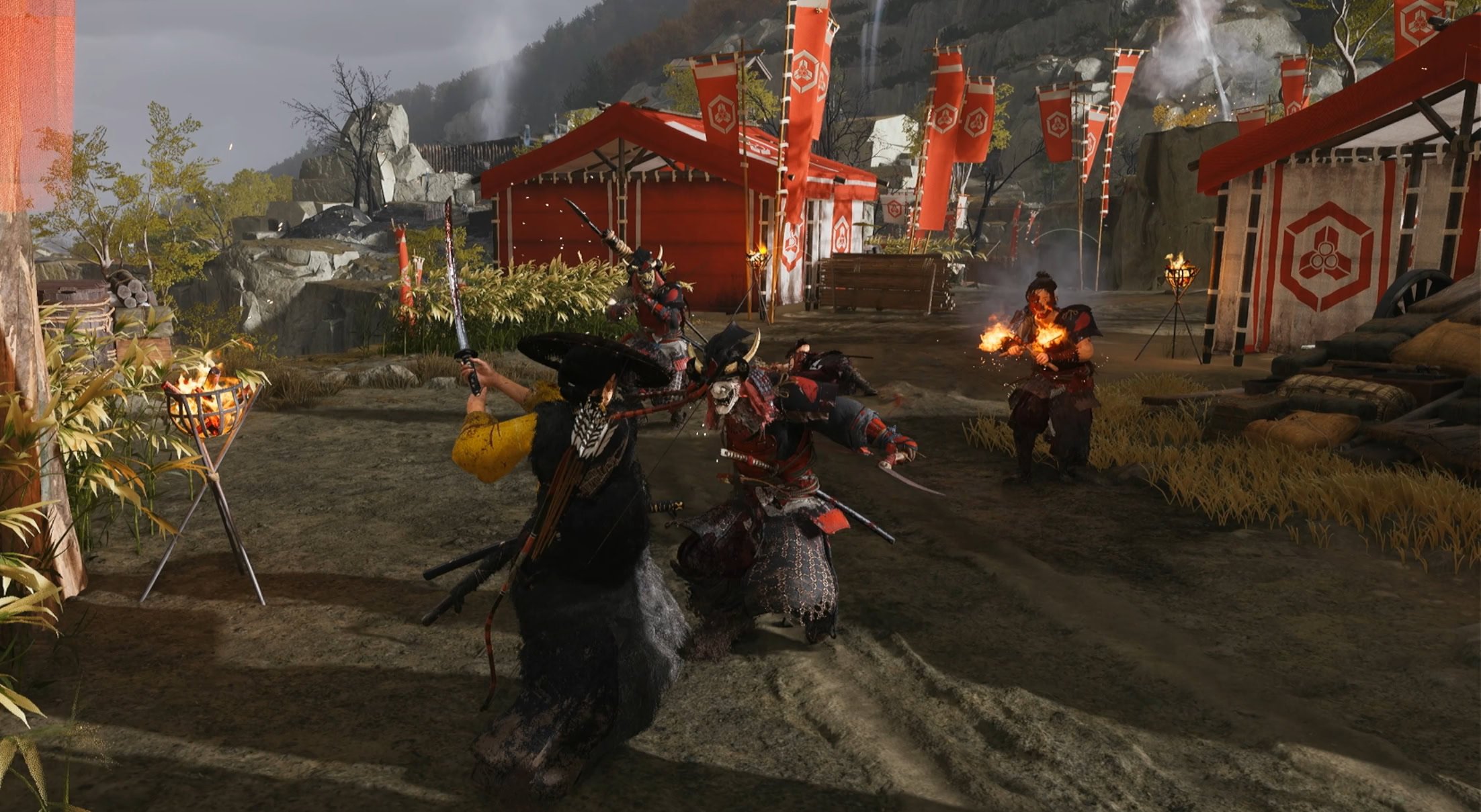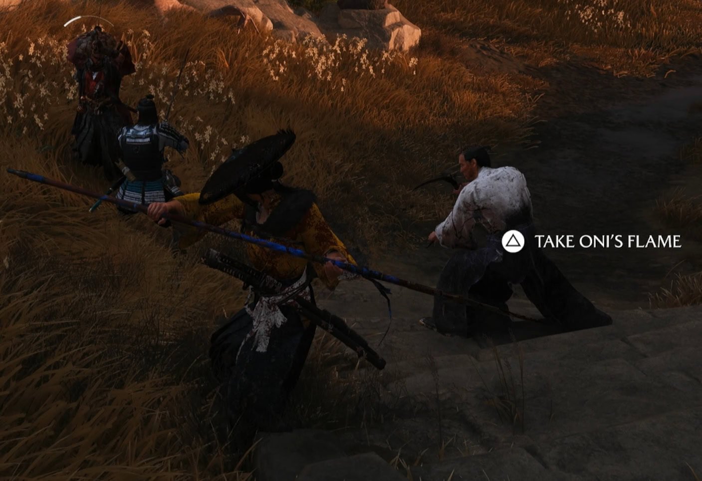 Defeat the bounty hunters at the shrine. If you run out of Oni’s Flames, you can run to Goro and get some off him with △. Avoid using this in the tall grass as you can ignite it, damaging anyone inside it.