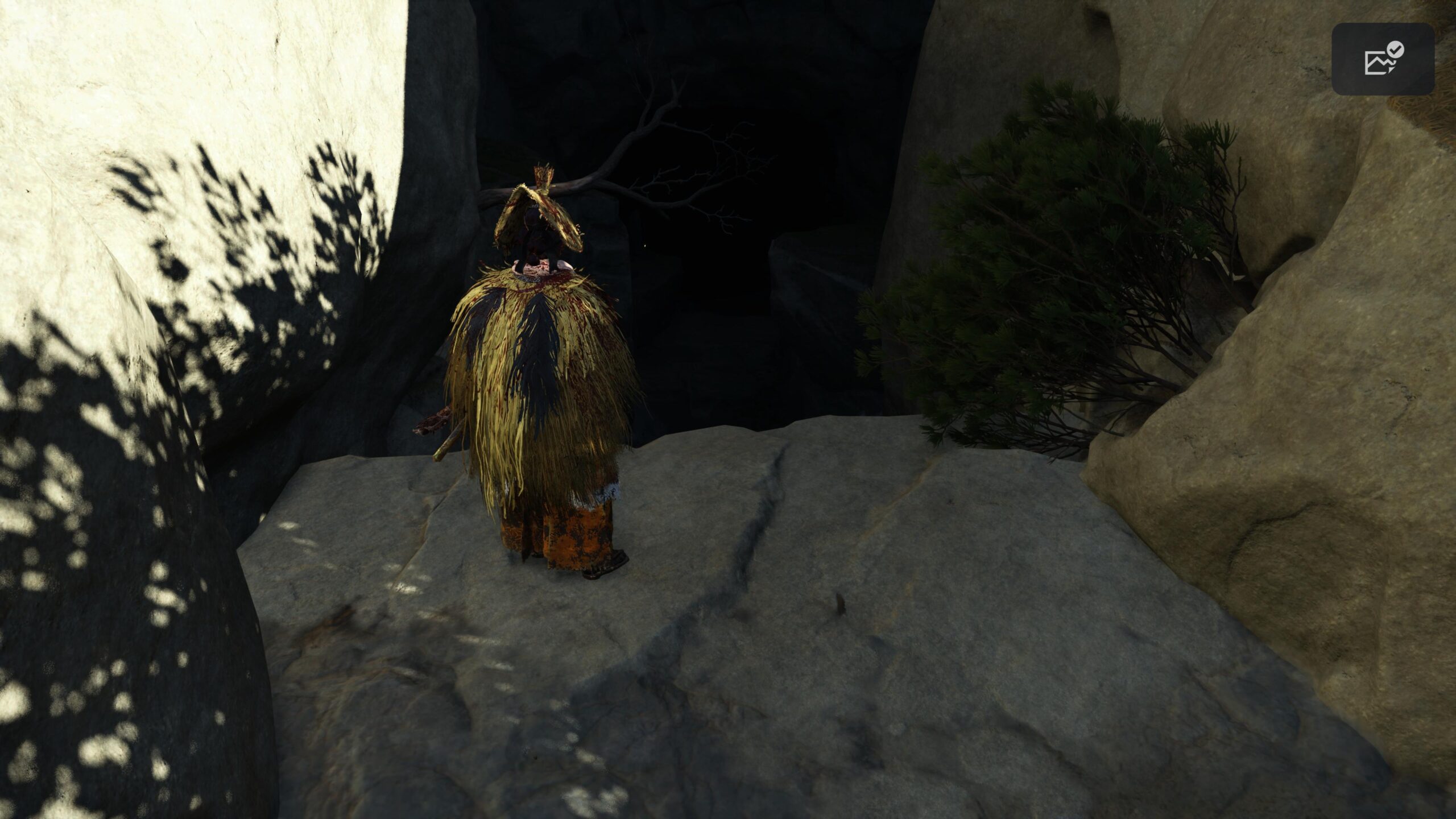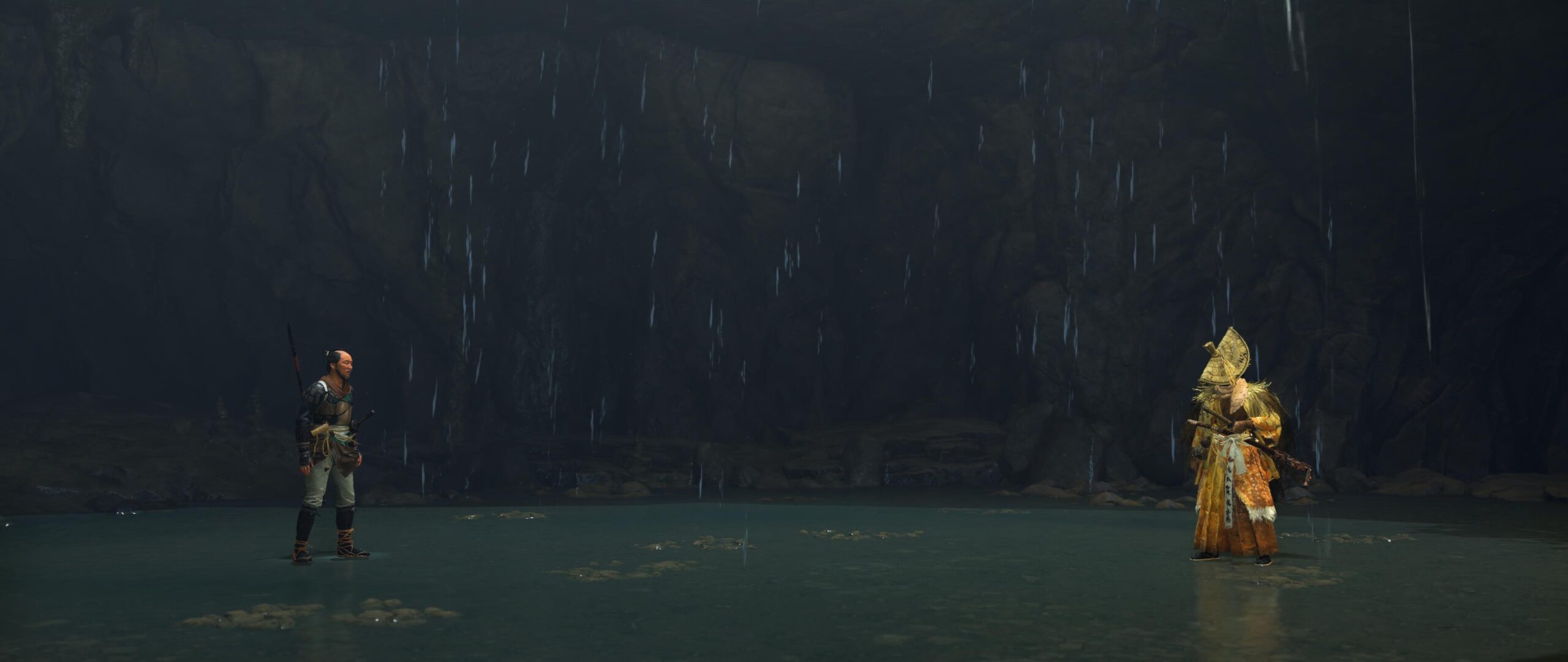 After defeating some other bounty hunters camped outside Soma’s cave at Lake Ozan, you’ll need to play Soma’s Song on your Shamisen at the door so he’ll let you inside. You won’t know how to play it yet, but it will be an option if you pull out your Shamisen here.