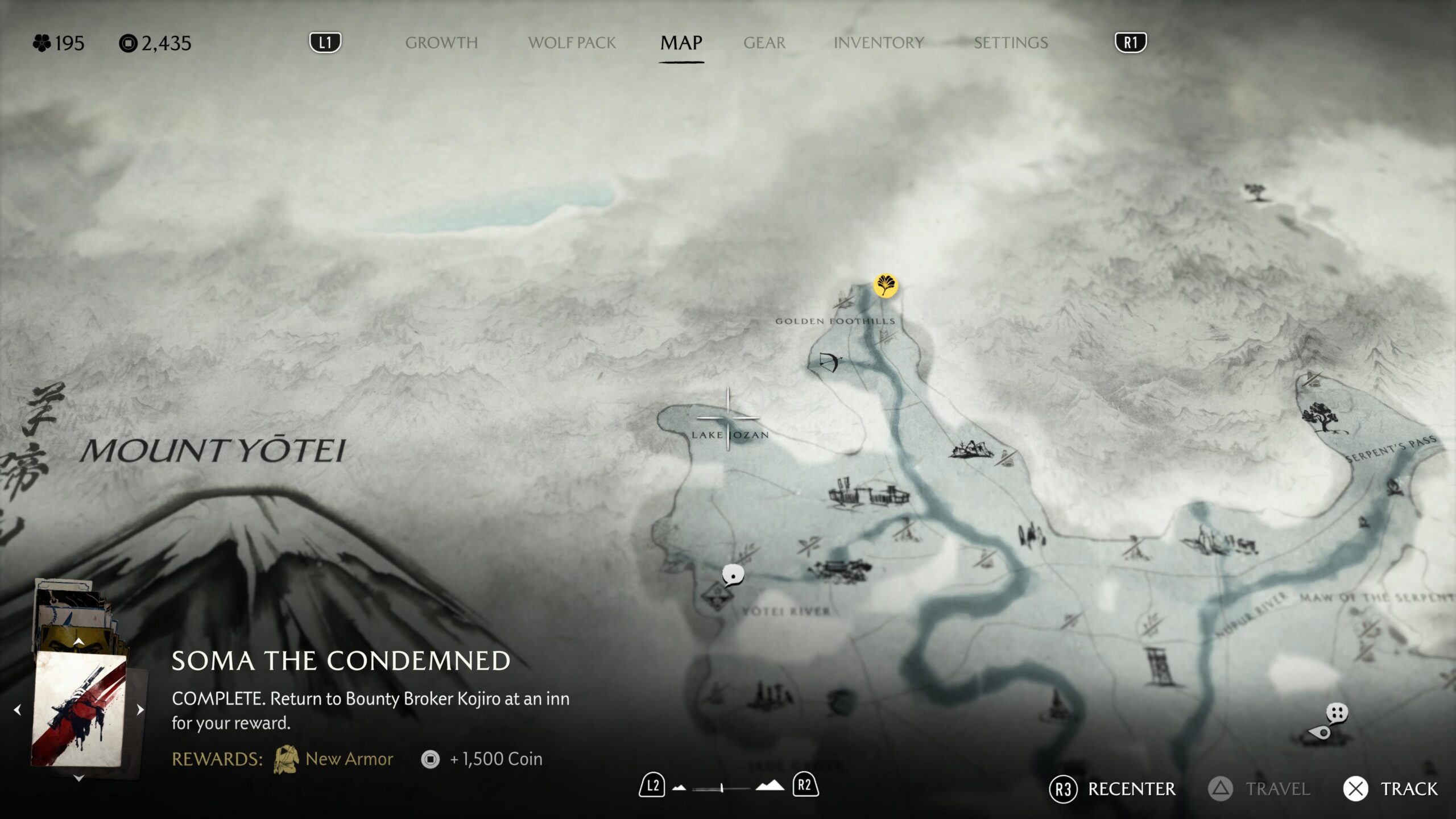 You receive the Bounty Master Armor, Soma’s Song, and 1,500 Coin for defeating Soma the Condemned in a cave at Lake Ozan in the northwestern corner of Yotei Grasslands.