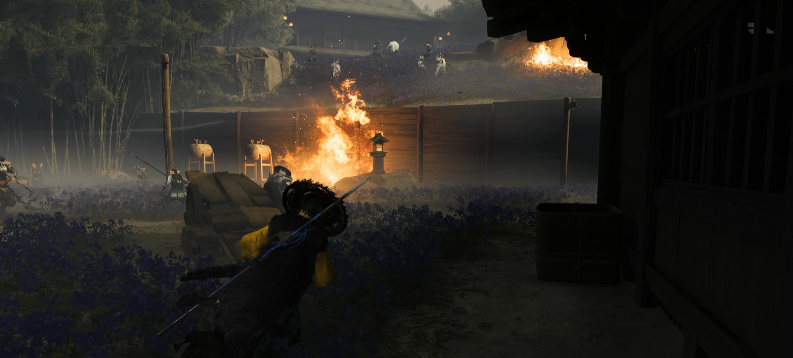 You’ll run into the Wolfsbane Garden where the Kitsune harvests them to make his poison. Survey the area and focus on the flower field closest to you, the worker near the wooden wall, and the Kitsune next to the far building.