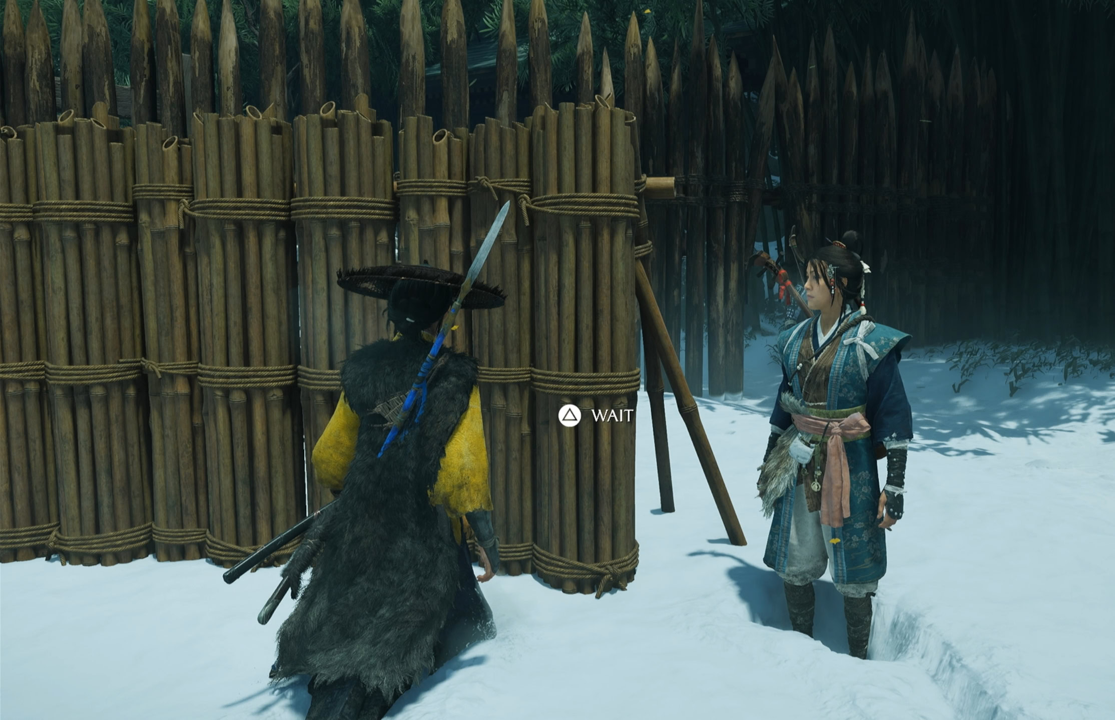 Follow Oyuki into the camp and she’ll lead you towards the gap in the wall. Wait behind the bundles of bamboo while Oyuki distracts the guard. Slip through the opening once he’s gone.