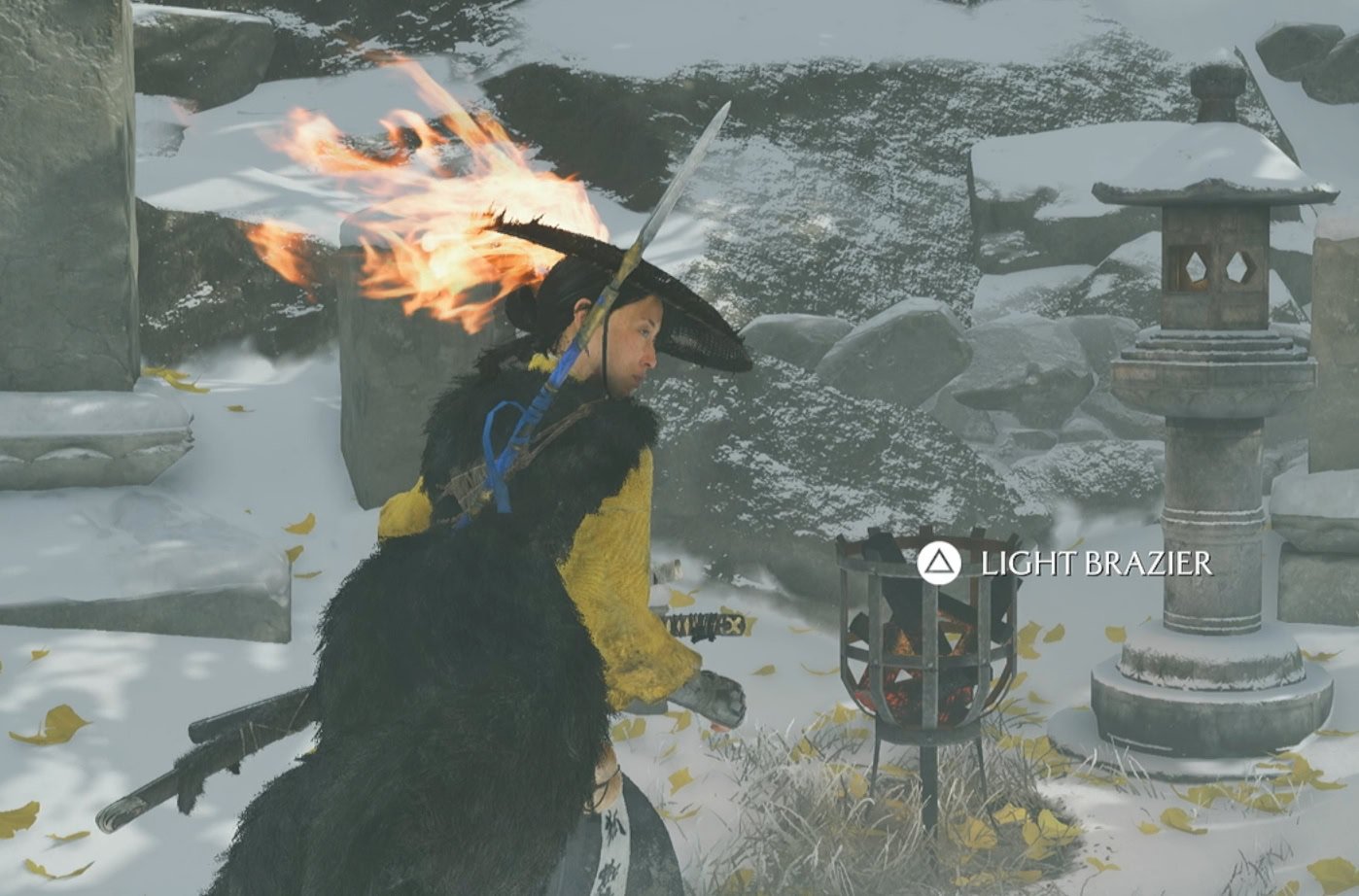On the following day, follow Oyuke back to the ginko tree and light the braziers around the cemetery. These braziers are laced with the toxin that the Kitsune uses and will be used to build up a resistance.