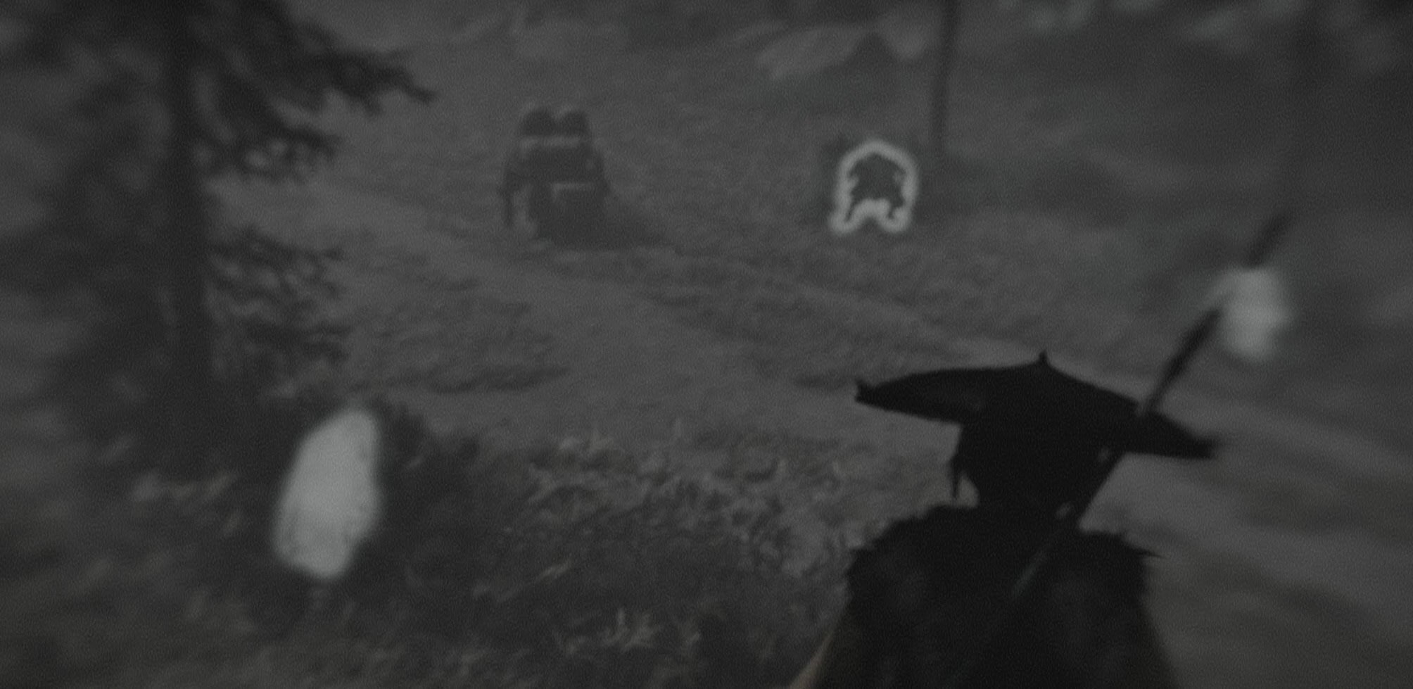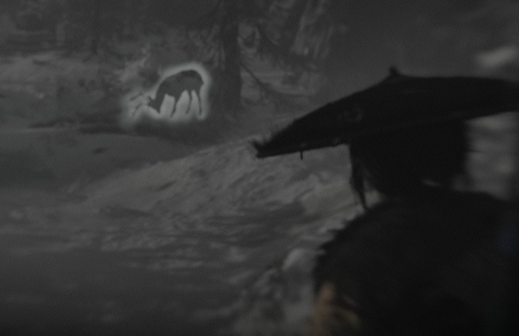 Follow Oyuki uphill to begin your listening training. Hold R3 to listen for sounds. When activated, your vision will gray and sound sources will have a white glow around them.