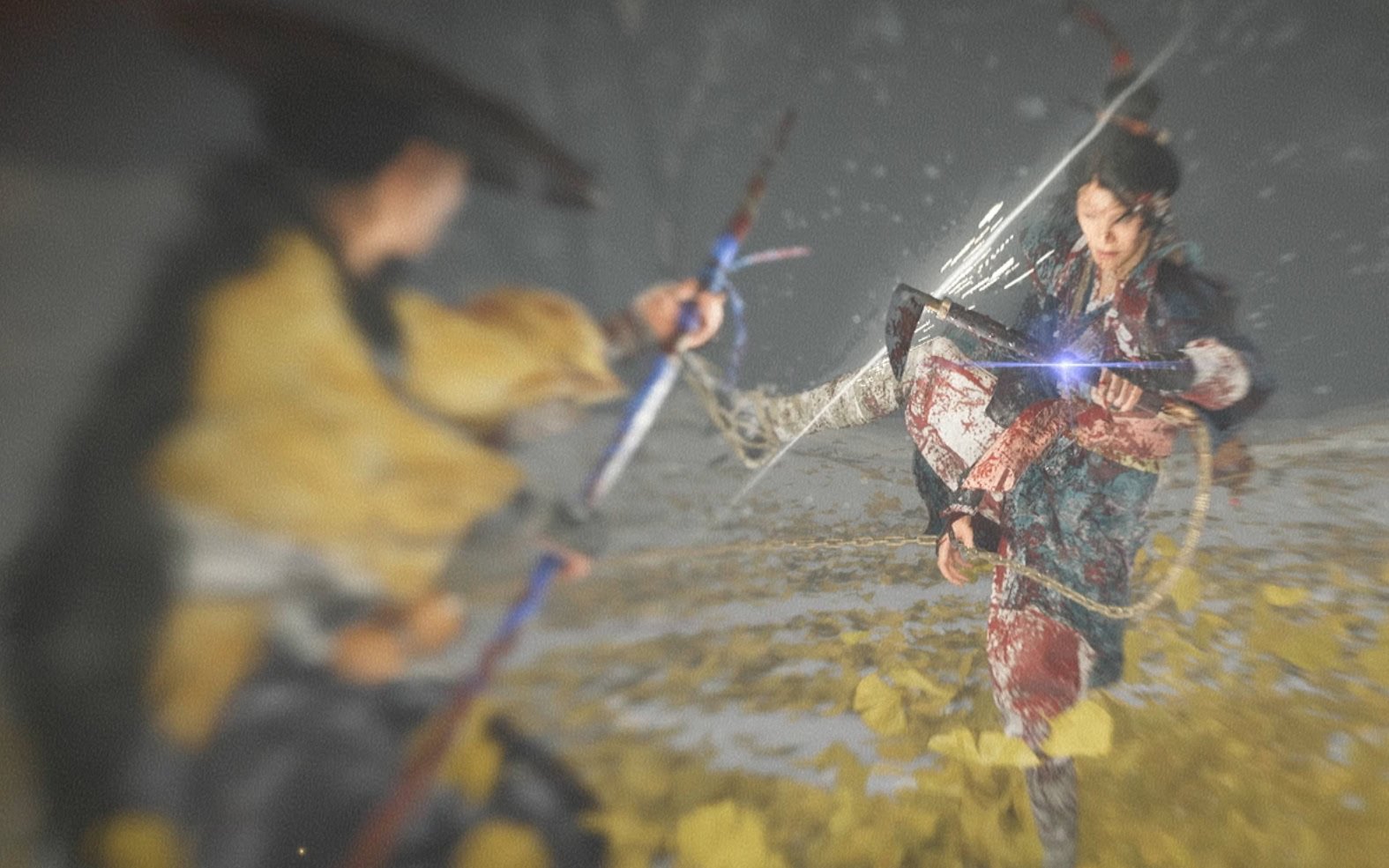 When her health gets low, Oyuki will modify her slide attack combo. When she slides in, she’ll make three normal attacks and a blue glint attack where she launches her chain at you.