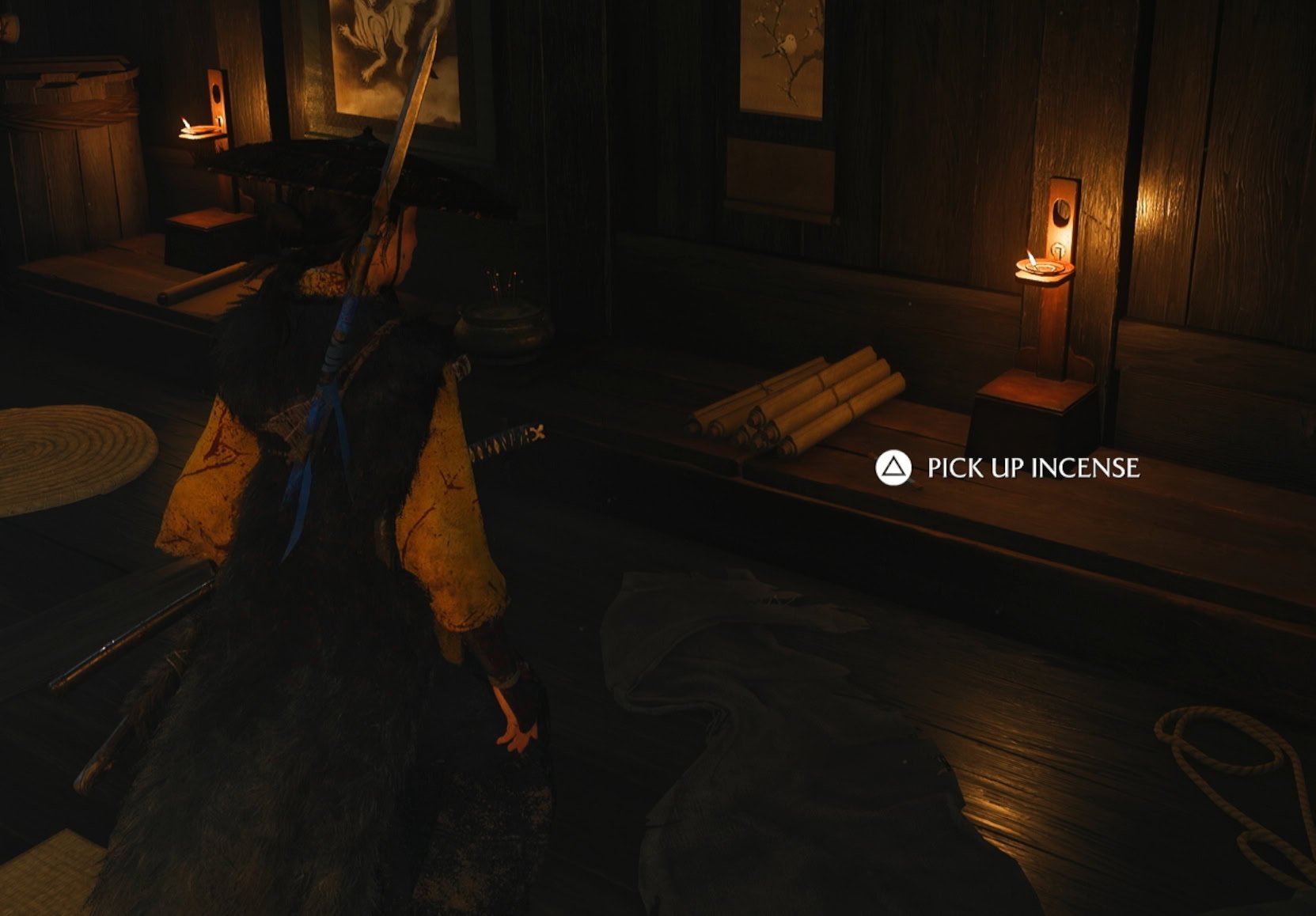 Continue following Oyuki’s instructions to find her while hidden, then follow her into the house and pick up the incense.