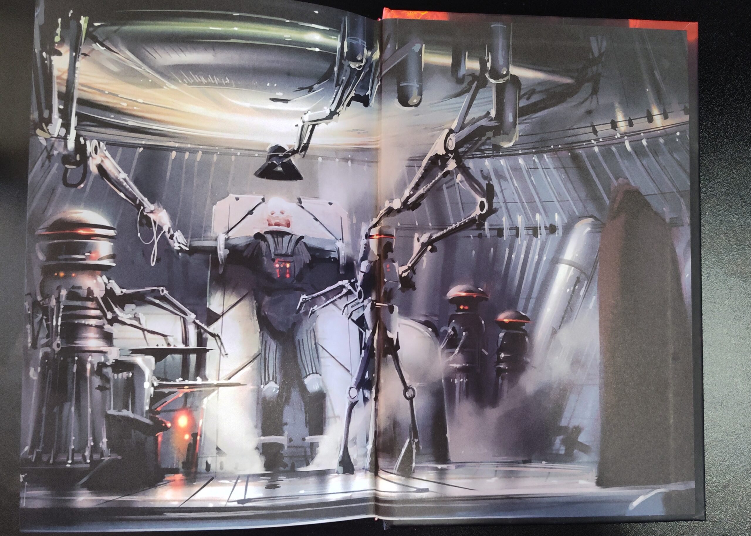 It also comes with illustrated endpapers. One has Anakin and Padmé in a cozy room, and the second shows the birth of Darth Vader. A very accurate way to tell the beginning and ending of this tragic story.