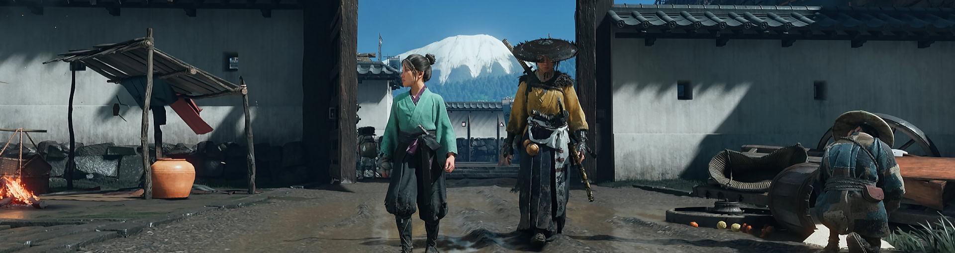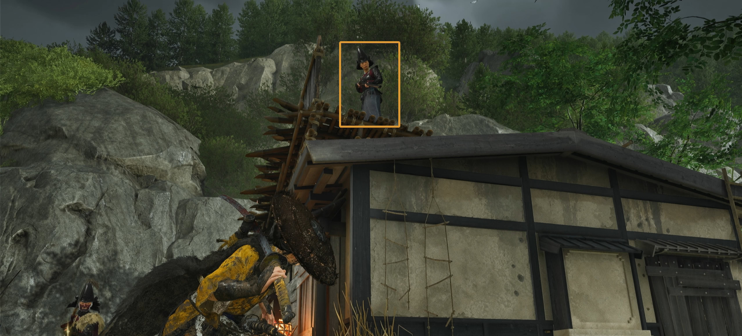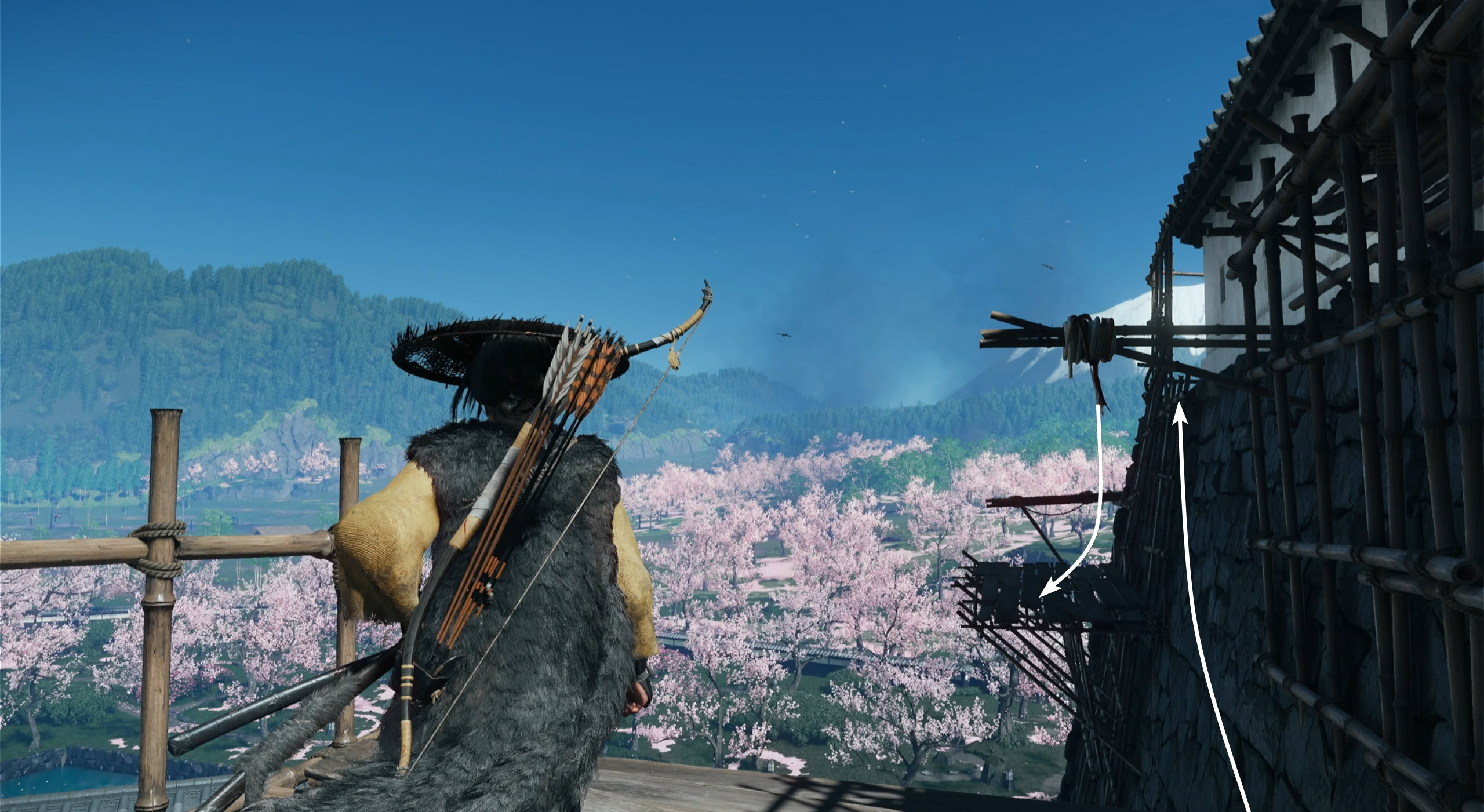 Through the power of deception, Kiku will talk the soldiers into going away to prevent an unnecessary fire. Use your grappling hook on the suspended rope above you to climb up the scaffolding.