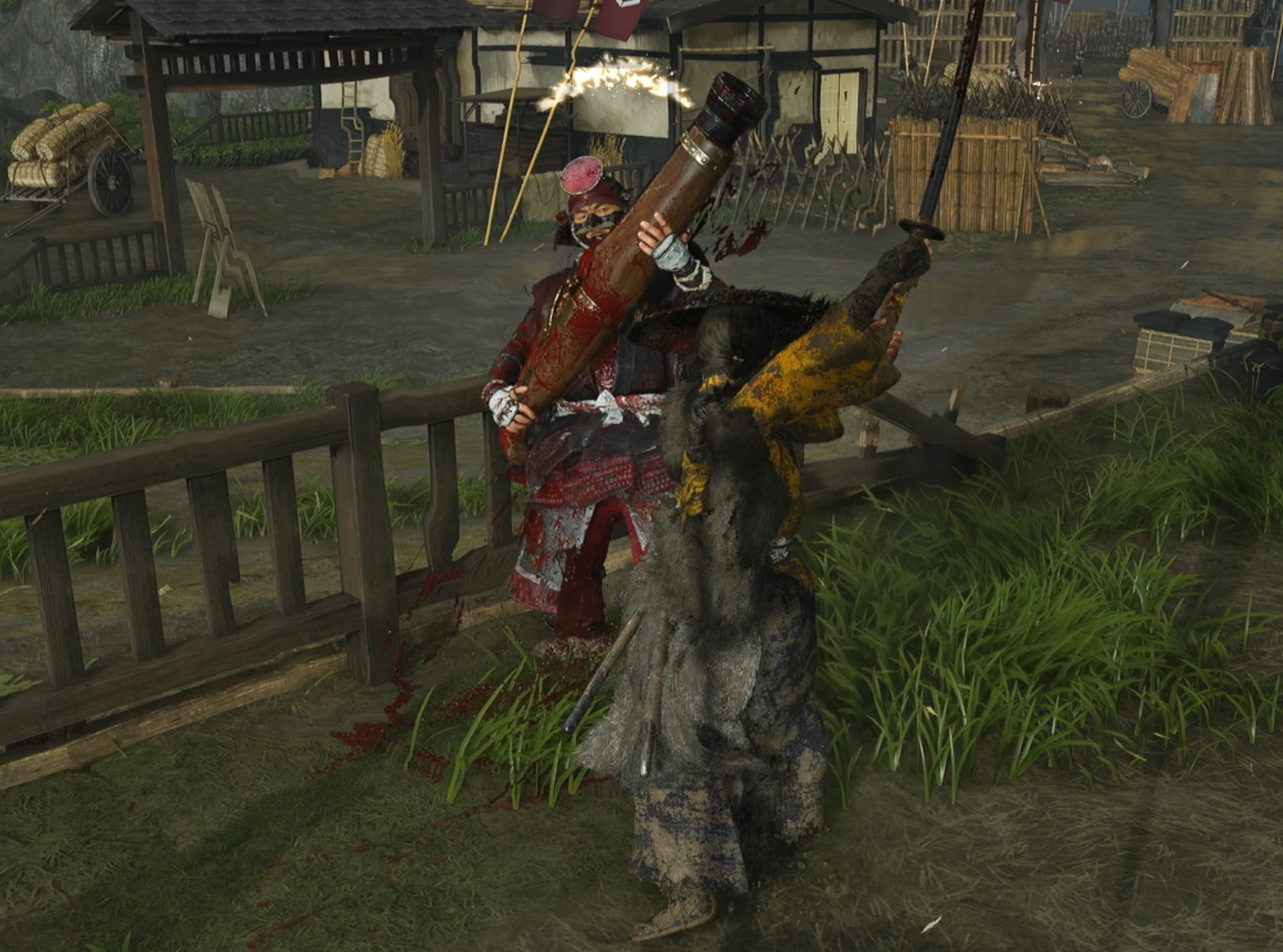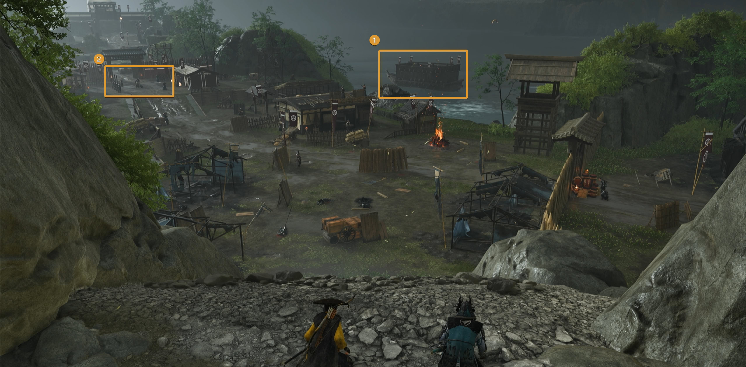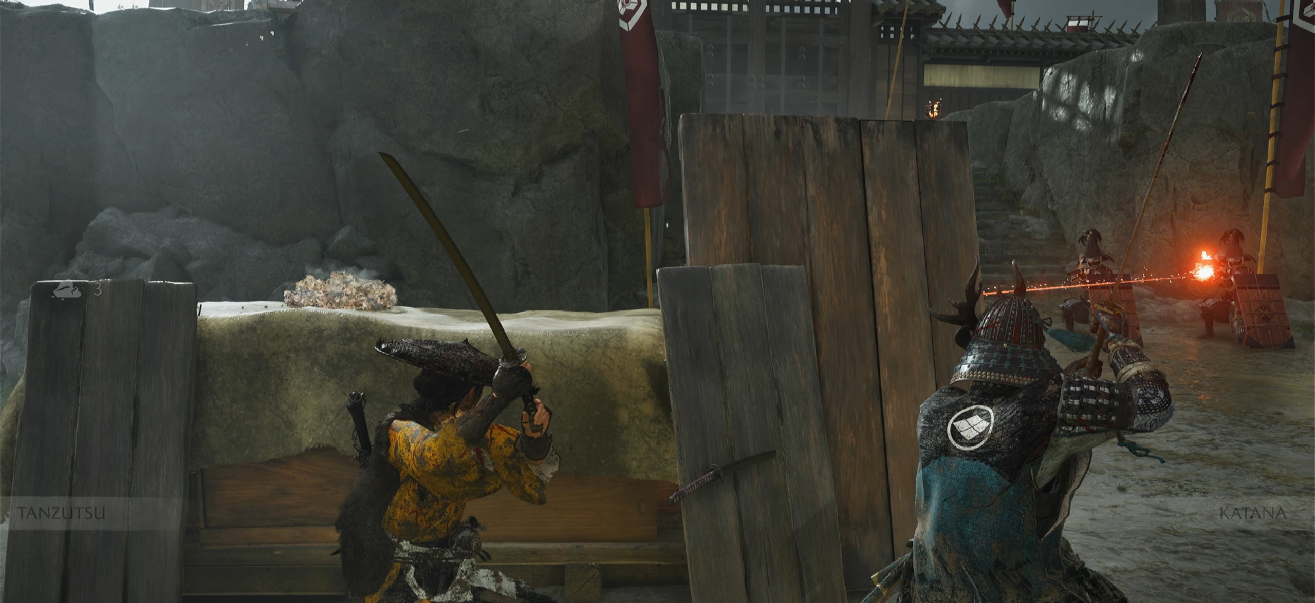 Through the power of deception, Kiku will talk the soldiers into going away to prevent an unnecessary fire. Use your grappling hook on the suspended rope above you to climb up the scaffolding.