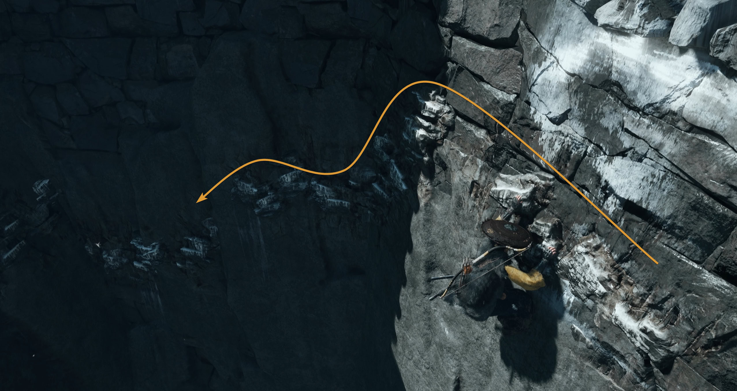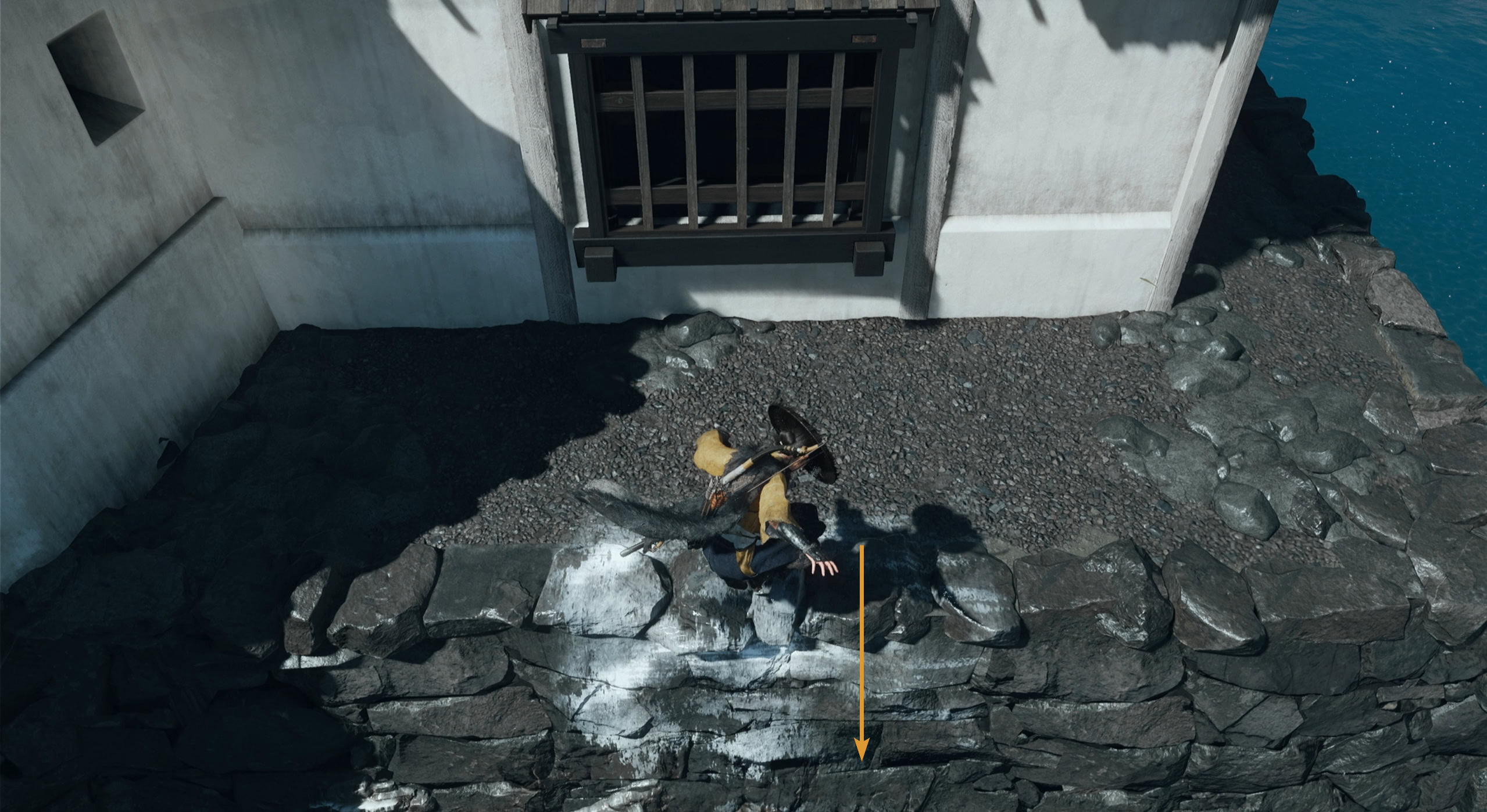You can talk to Kiku through the windows. Keep going ahead until you reach a dead end. Climb down the white part of the ledge and continue climbing across the wall.
