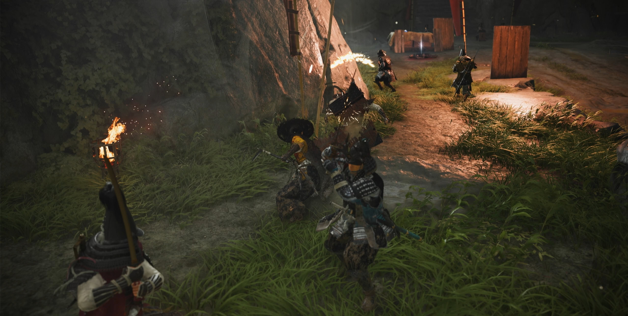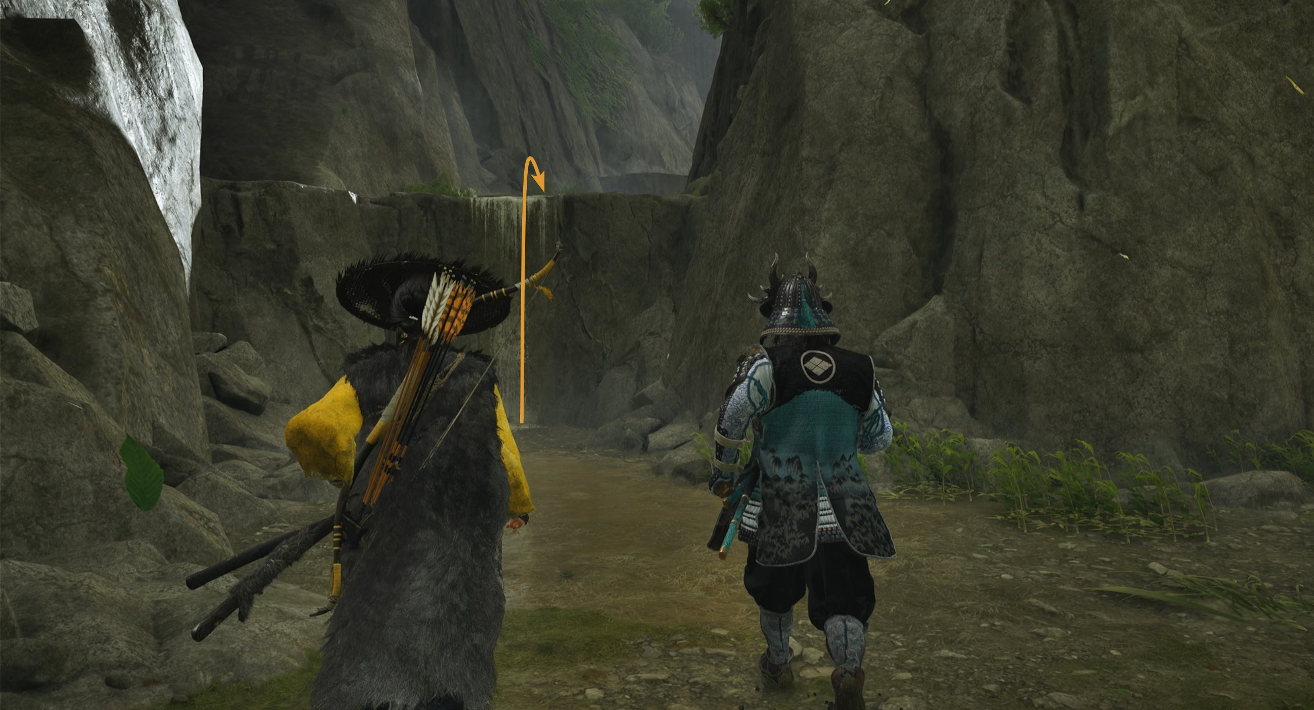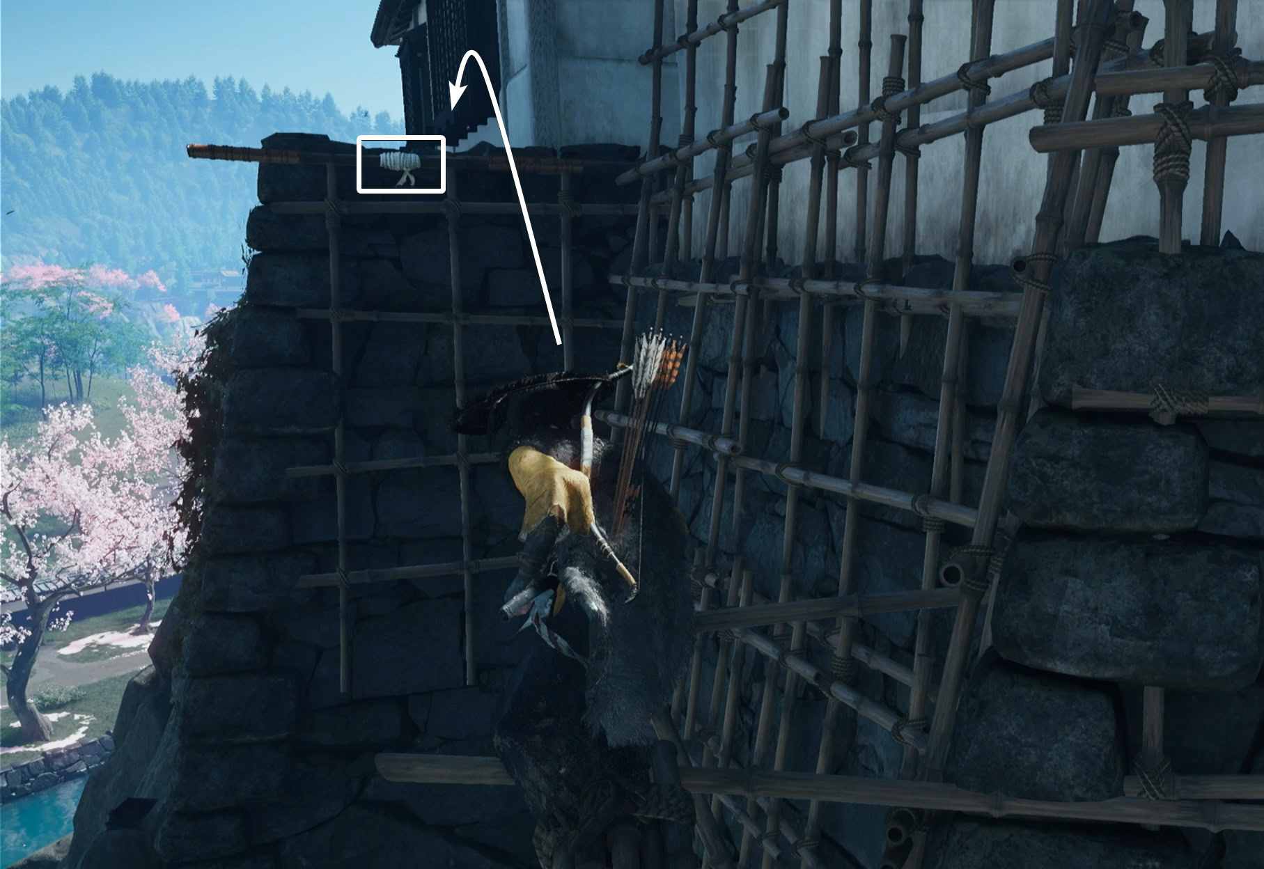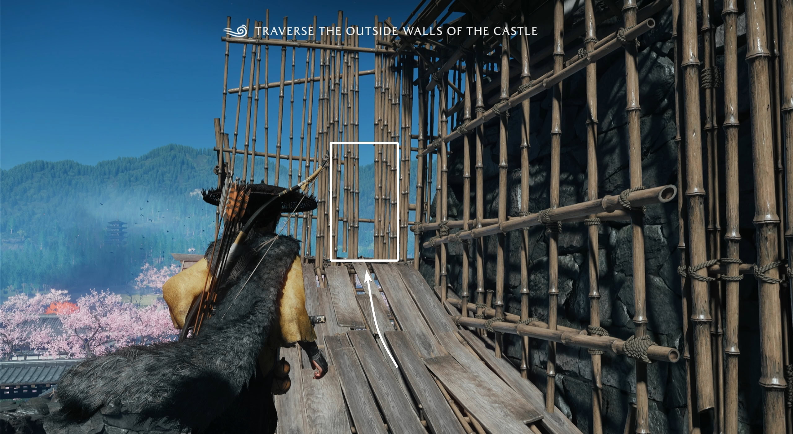 Boost Kiku up the ledge and look to the left for a gap in the bamboo scaffolding. Squeeze through and use your grappling hook to get across the walls.