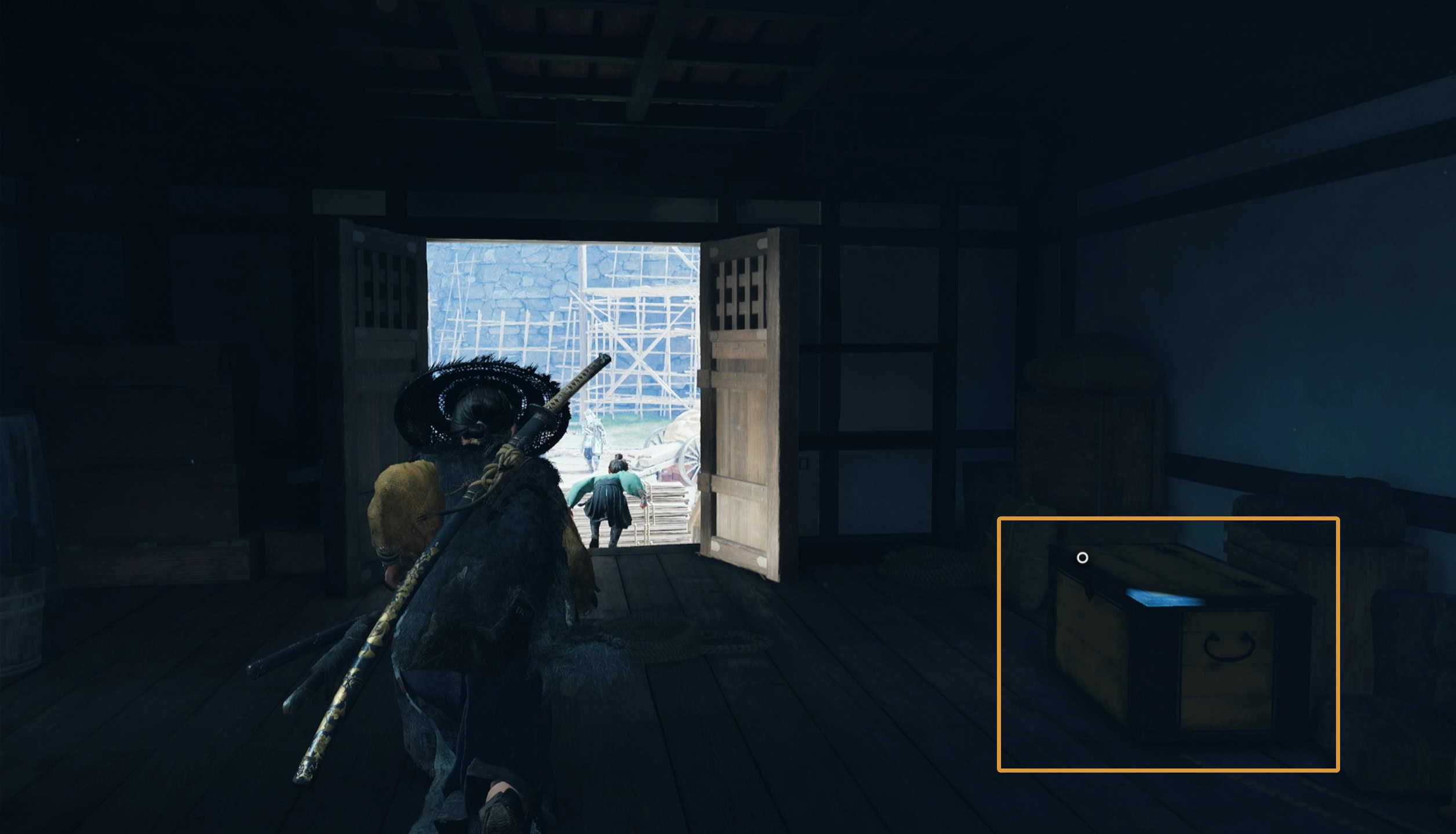 Follow Kiku up the scaffolding leading up to the castle. When you jump through the window into a small building, loot the yellow chest to the right.