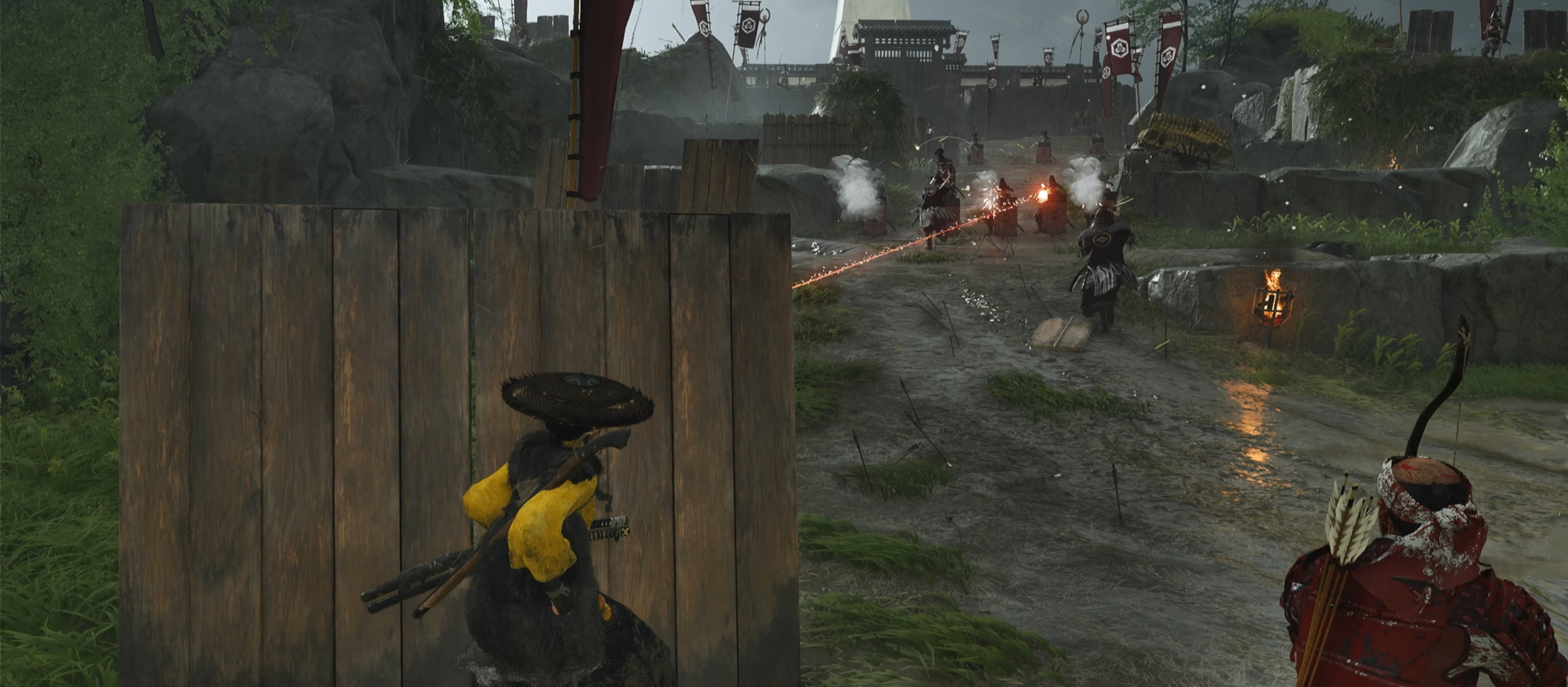 When you hide behind the wooden planks, you’ll need to observe the area. Look at the armory to the left, the soldiers ahead of you, and the brazier to the right.