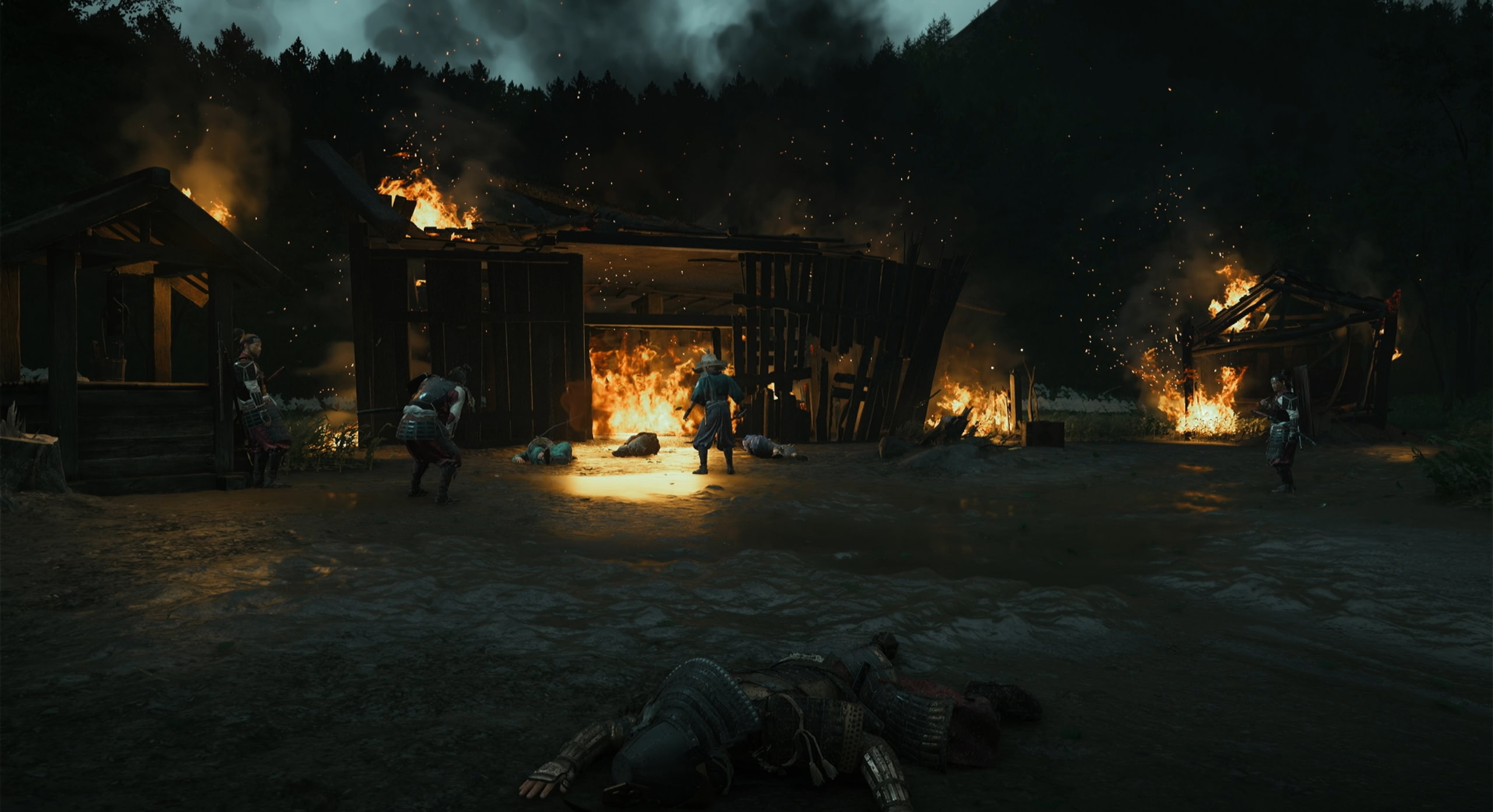 You’ll find Onusuke and his gang at a burning house. They’re all looking away from you, so they’ll be easy targets to snipe with your bow from within the tall grass.
