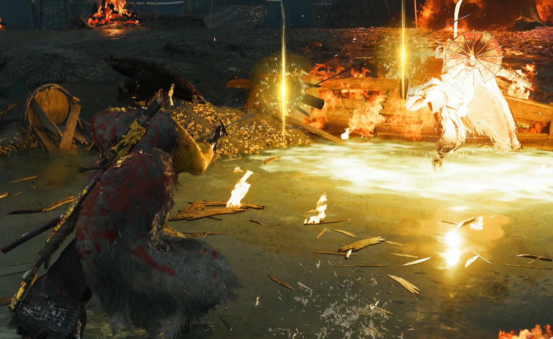 When the Dragon gets down to around 75% health, he’ll lock swords with Atsu and then switch to his naginata.