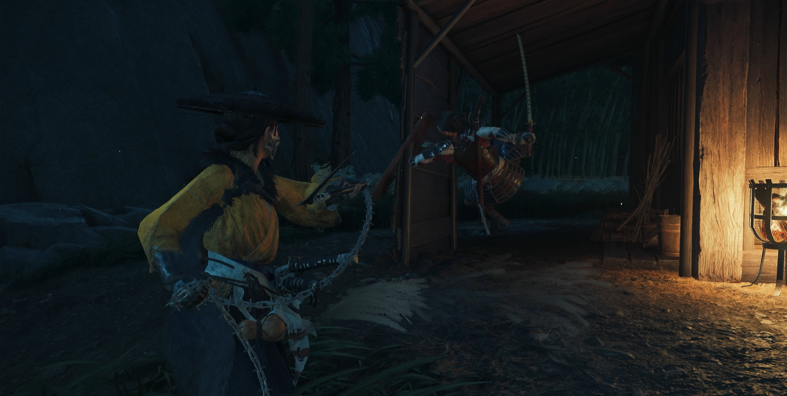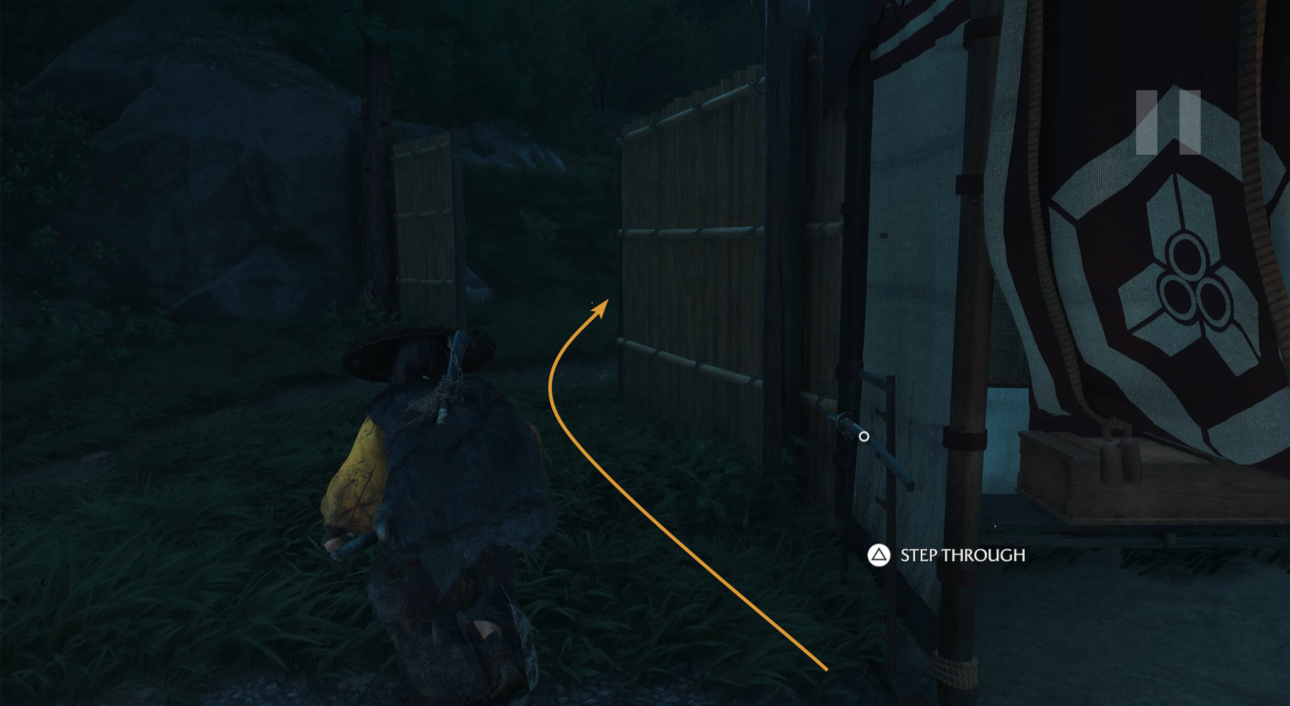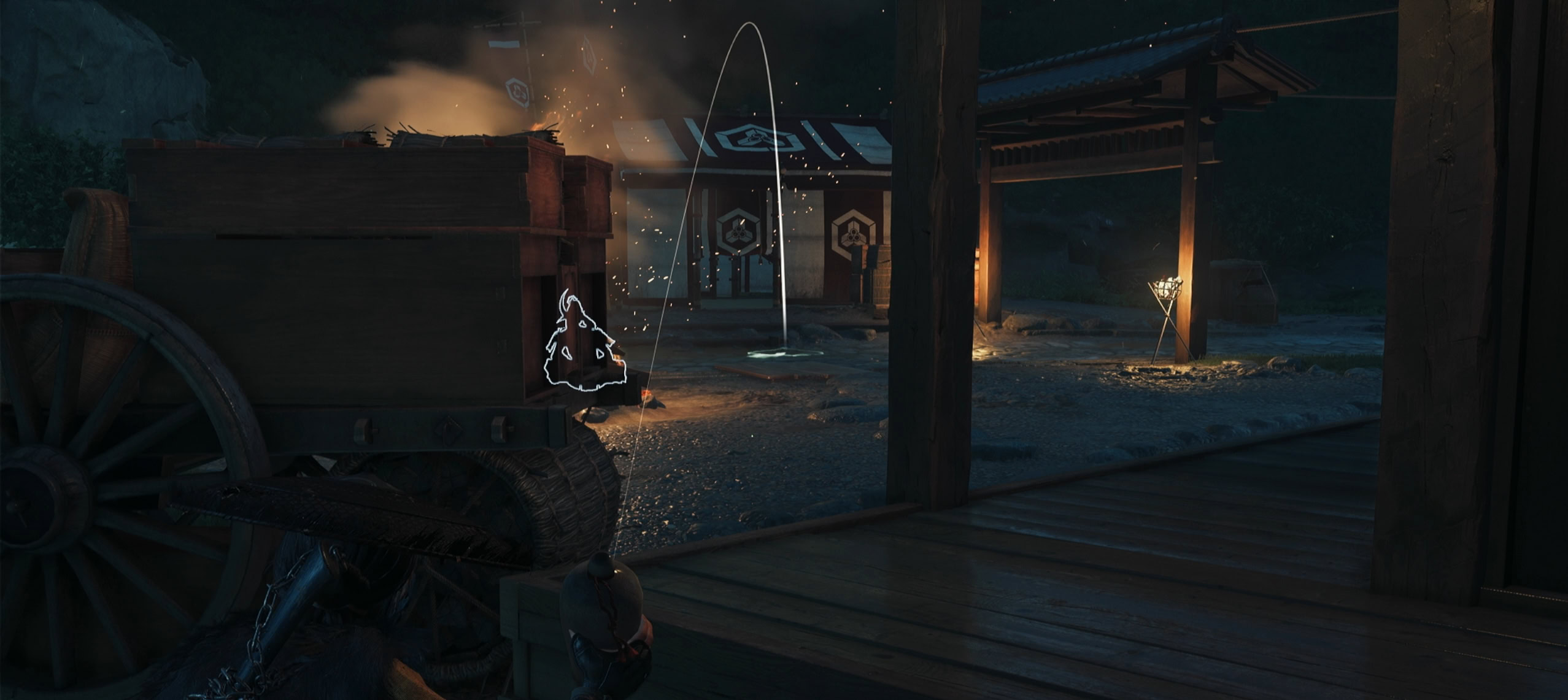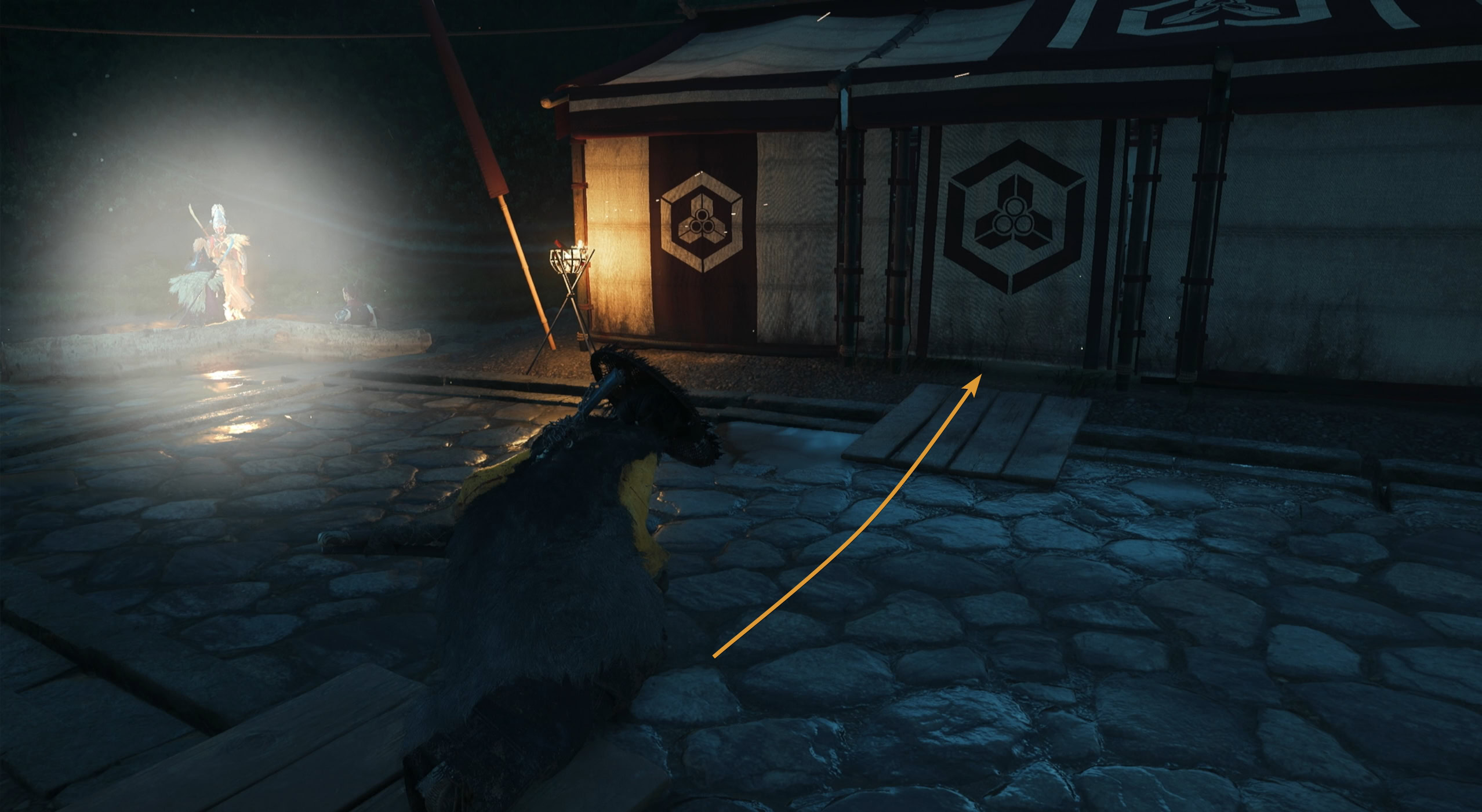 When you’re in the tall grass, go to the right across the path that leads downhill, open the purple supply chest, and hide behind a cart. Use a nearby sake bottle to distract a soldier sitting and facing your way at the campfire. Sneak into the house to the fight once he’s facing away from you.