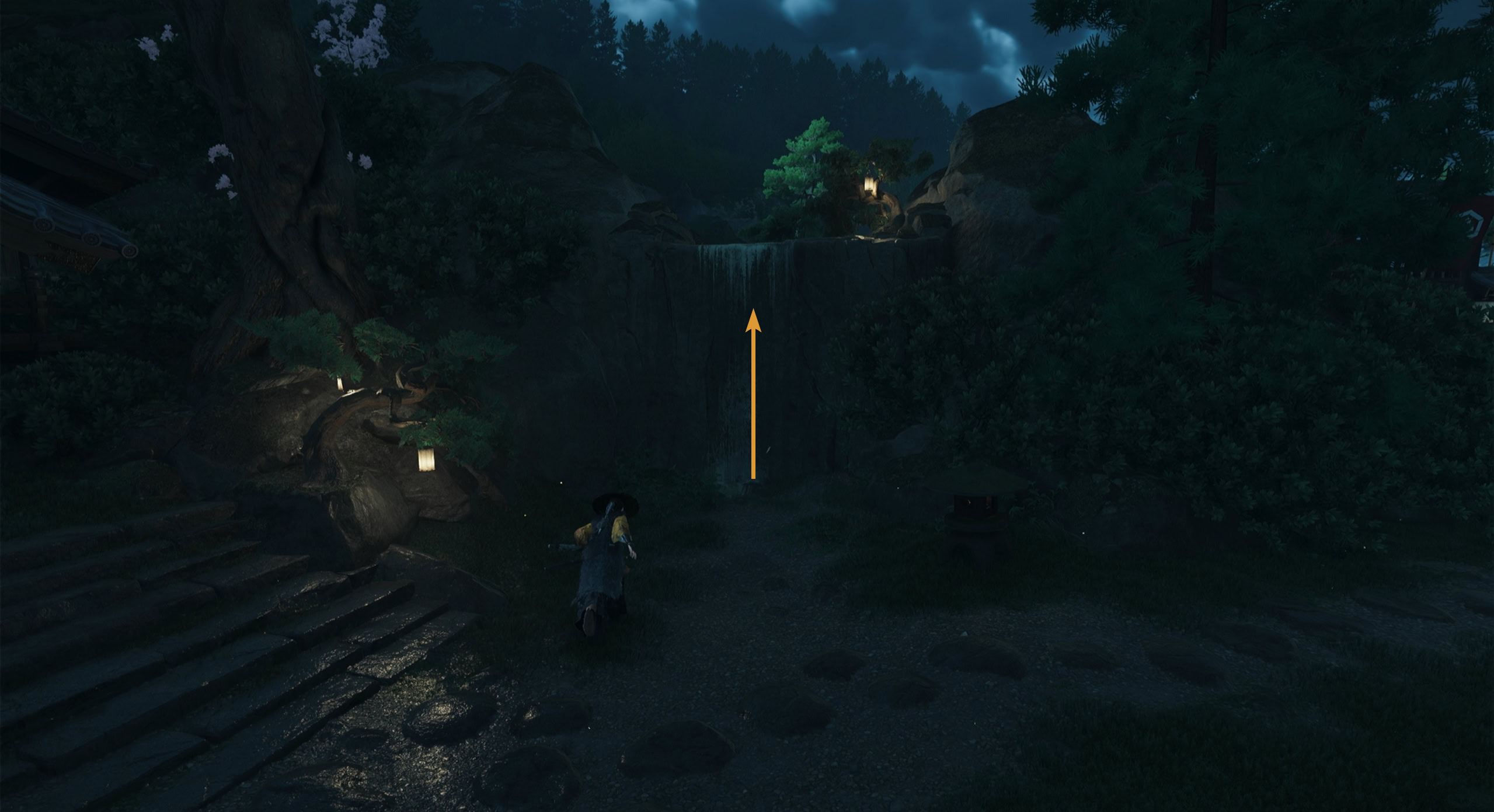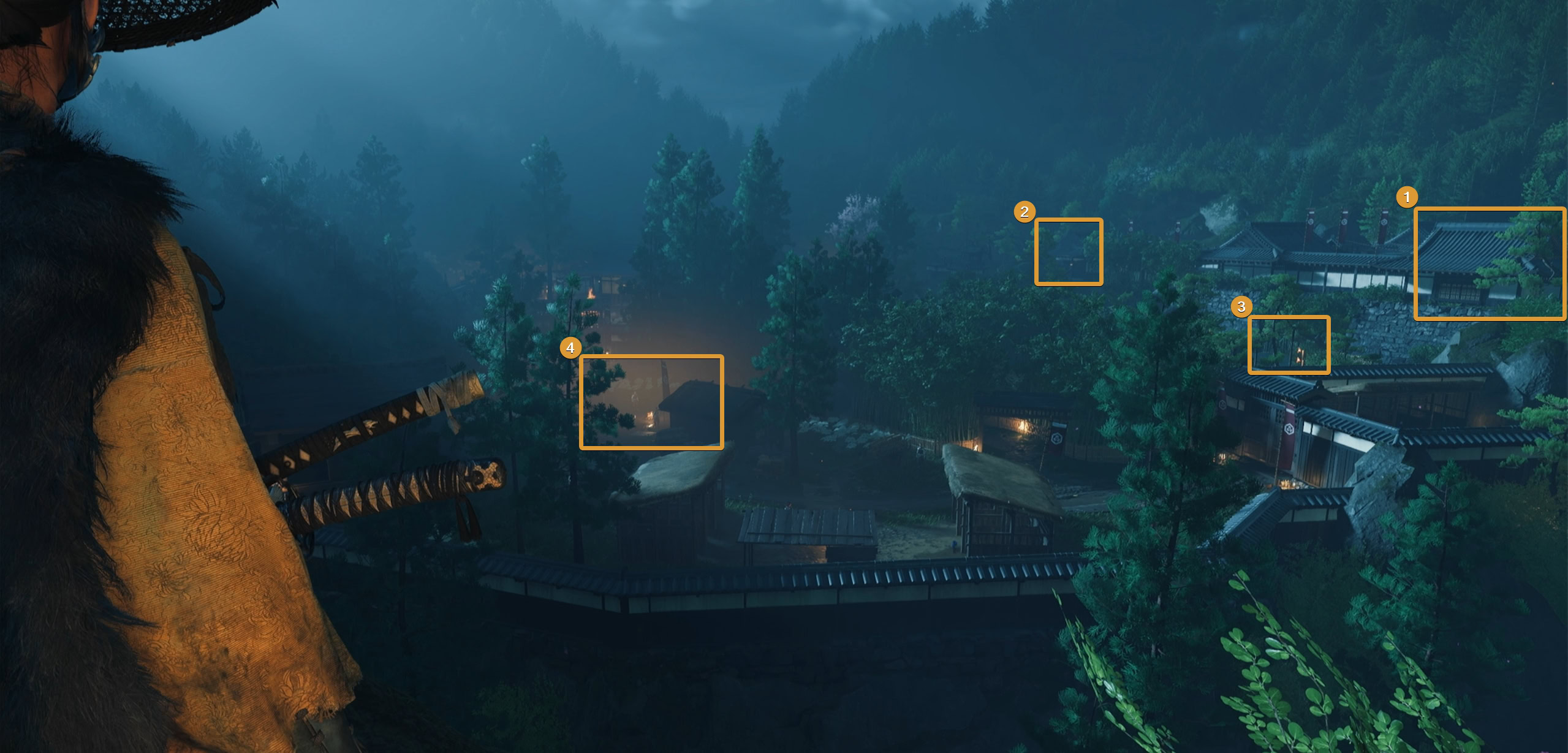 Follow Kiku through the rocky outcrops to reach a vantage point where you can survey the estate. You’ll want to view the following locations: