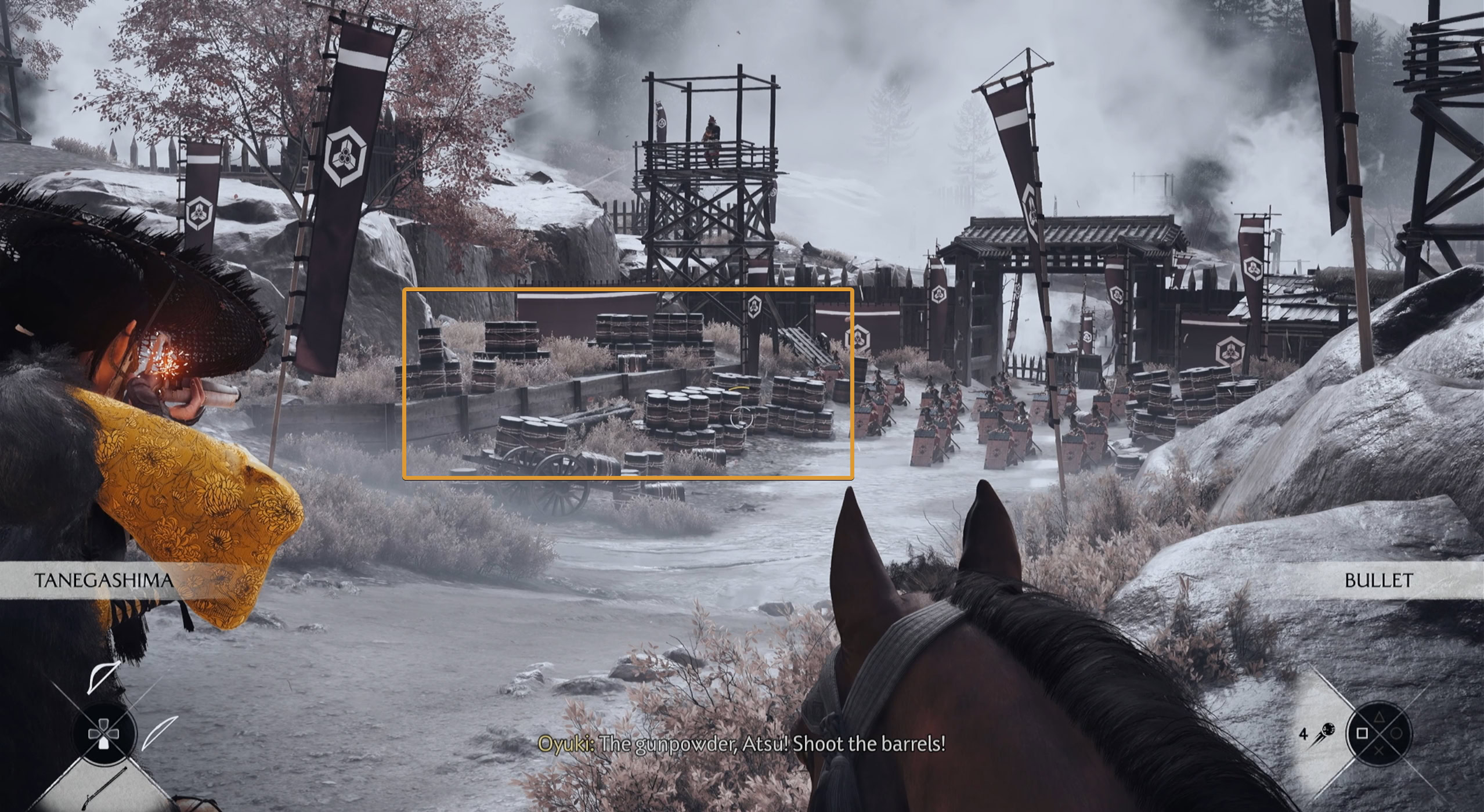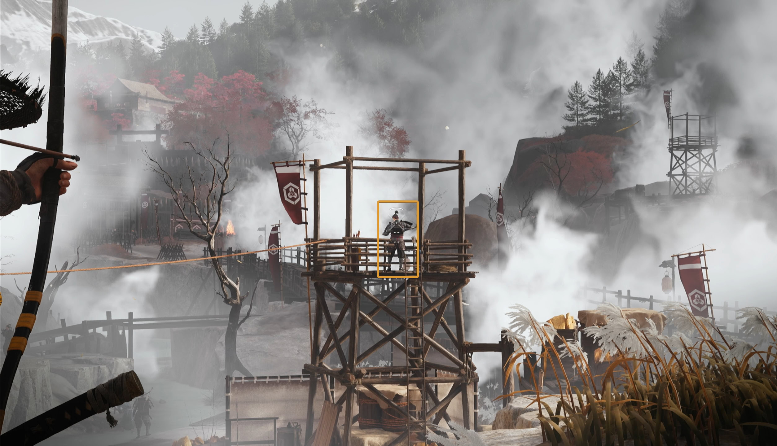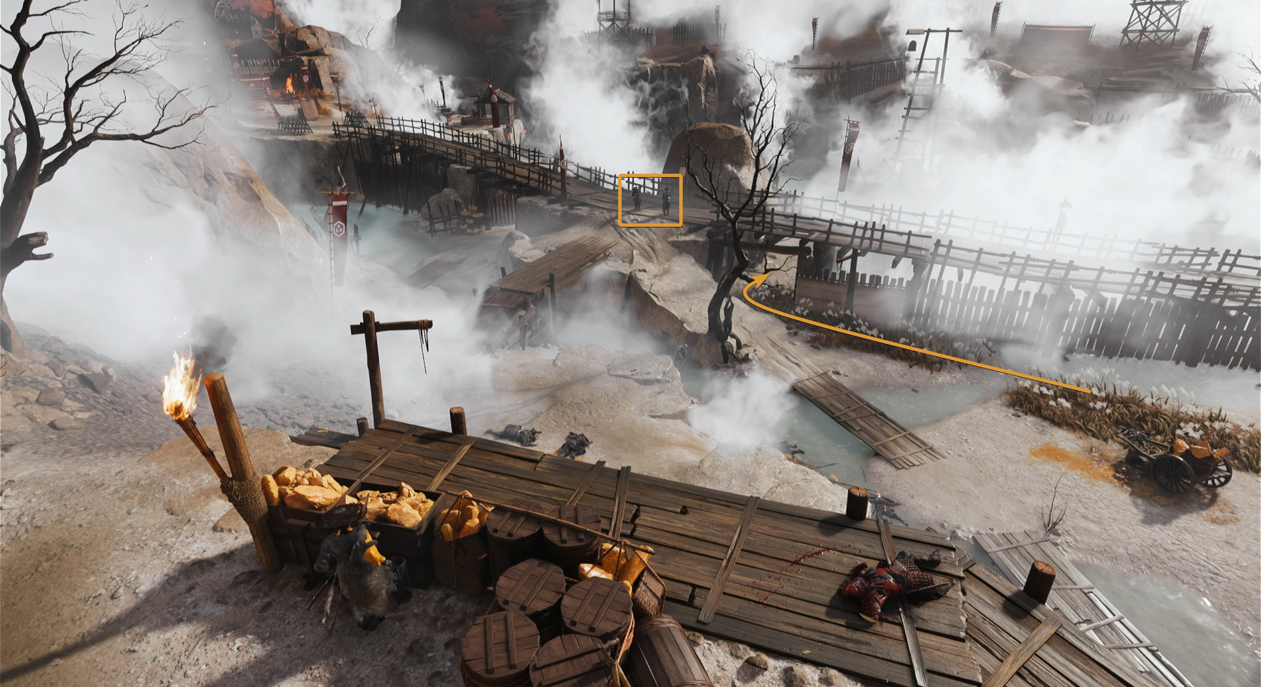 Sneak to the tall grass ahead and kusarigama kill the soldier next to the sulfur cart. Use the bow to headshot the soldier near the stream of water, then when a guard from the left follows up to check on him, use concentrate and headshot him as well.