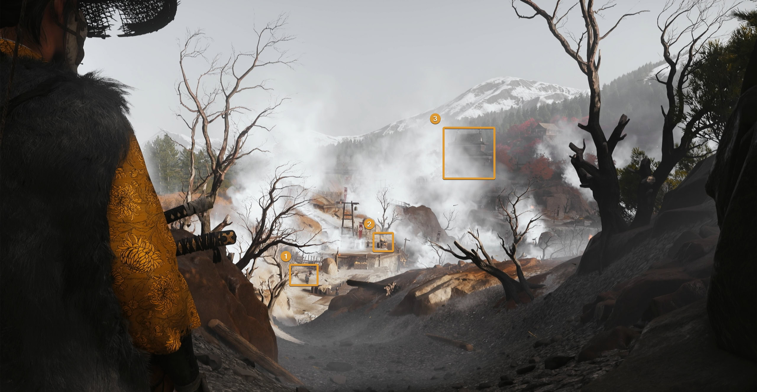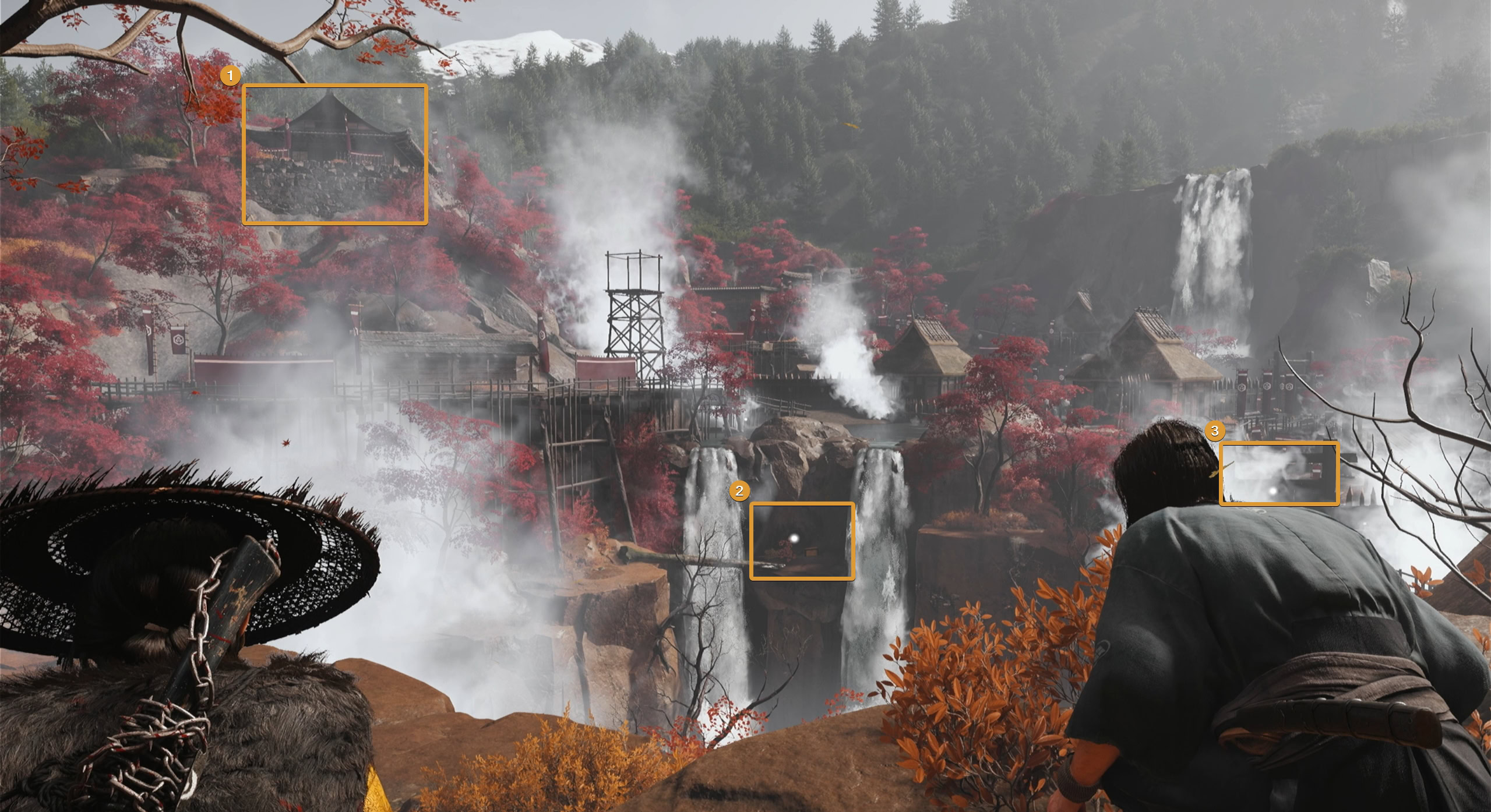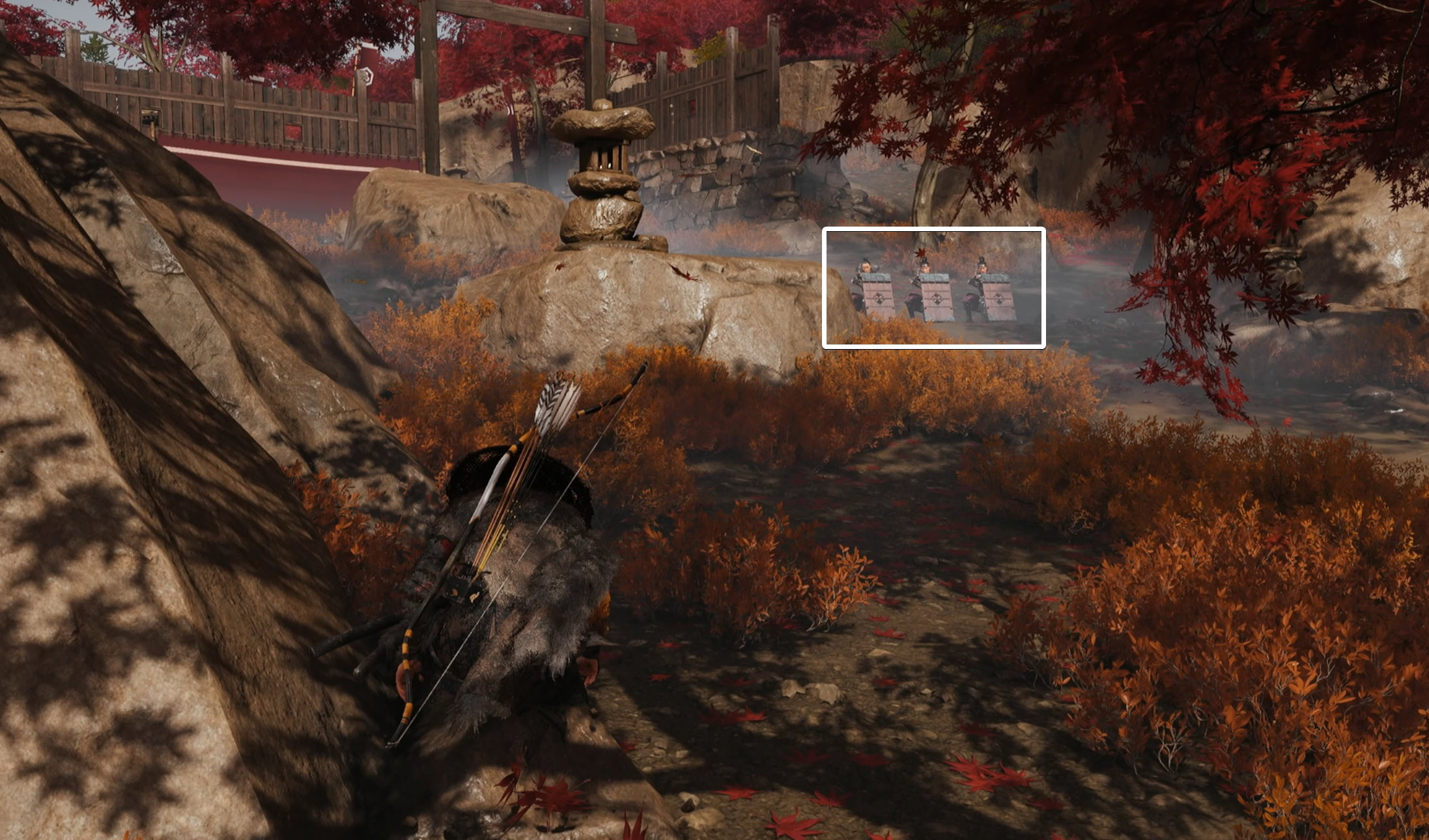 Sneak to the tall grass ahead and kusarigama kill the soldier next to the sulfur cart. Use the bow to headshot the soldier near the stream of water, then when a guard from the left follows up to check on him, use concentrate and headshot him as well.