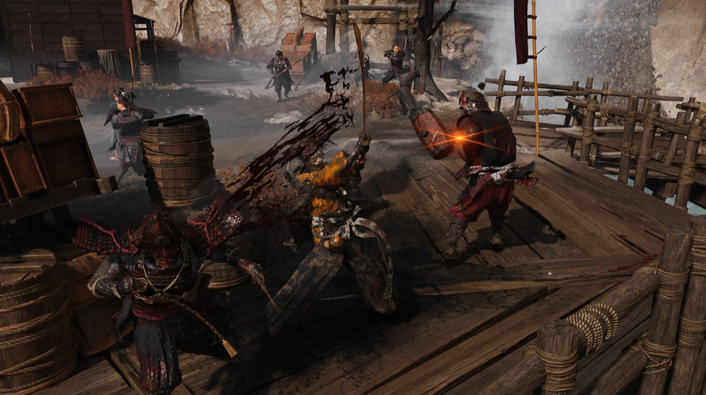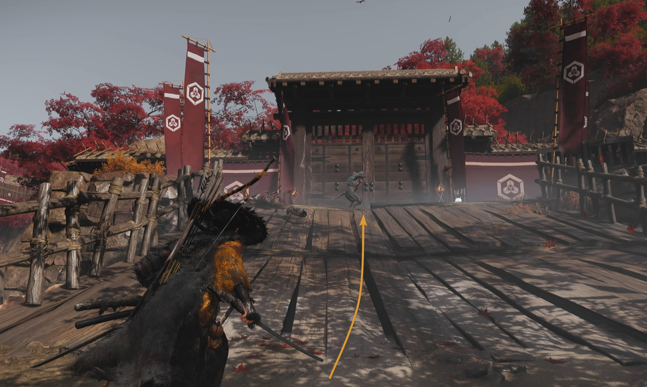 Avoid fighting in tight areas such as the bridge, draw out the soldiers to open areas so you have more room to dodge if needed. When they’re defeated, continue going uphill and go through the gate near the banners.
