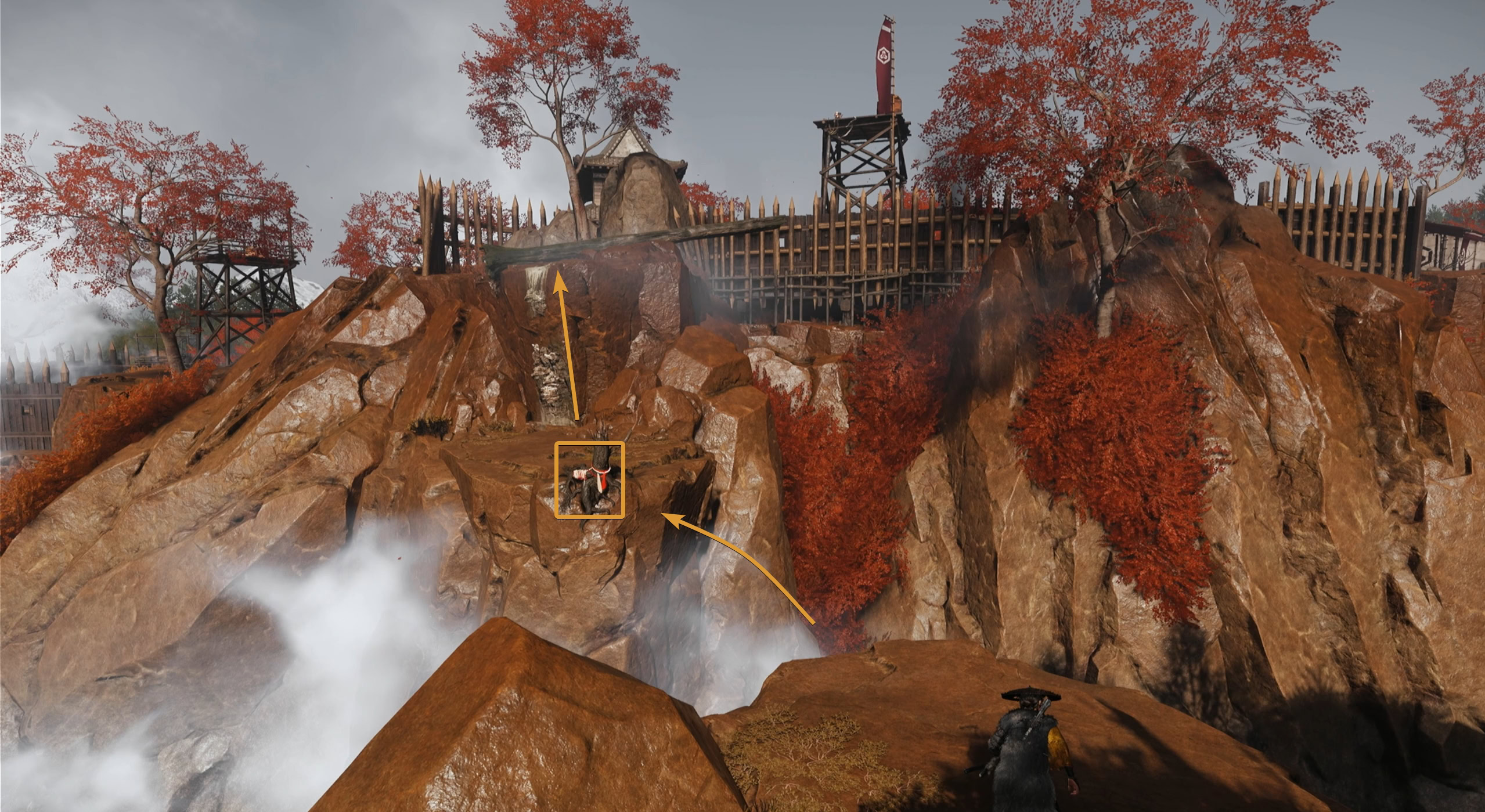 With Jubei safe, squeeze through the fence and survey the area full of waterfalls ahead. Observe the tower to the left, the chest near the log near the waterfalls, and the gate leading into the fort on the right.
