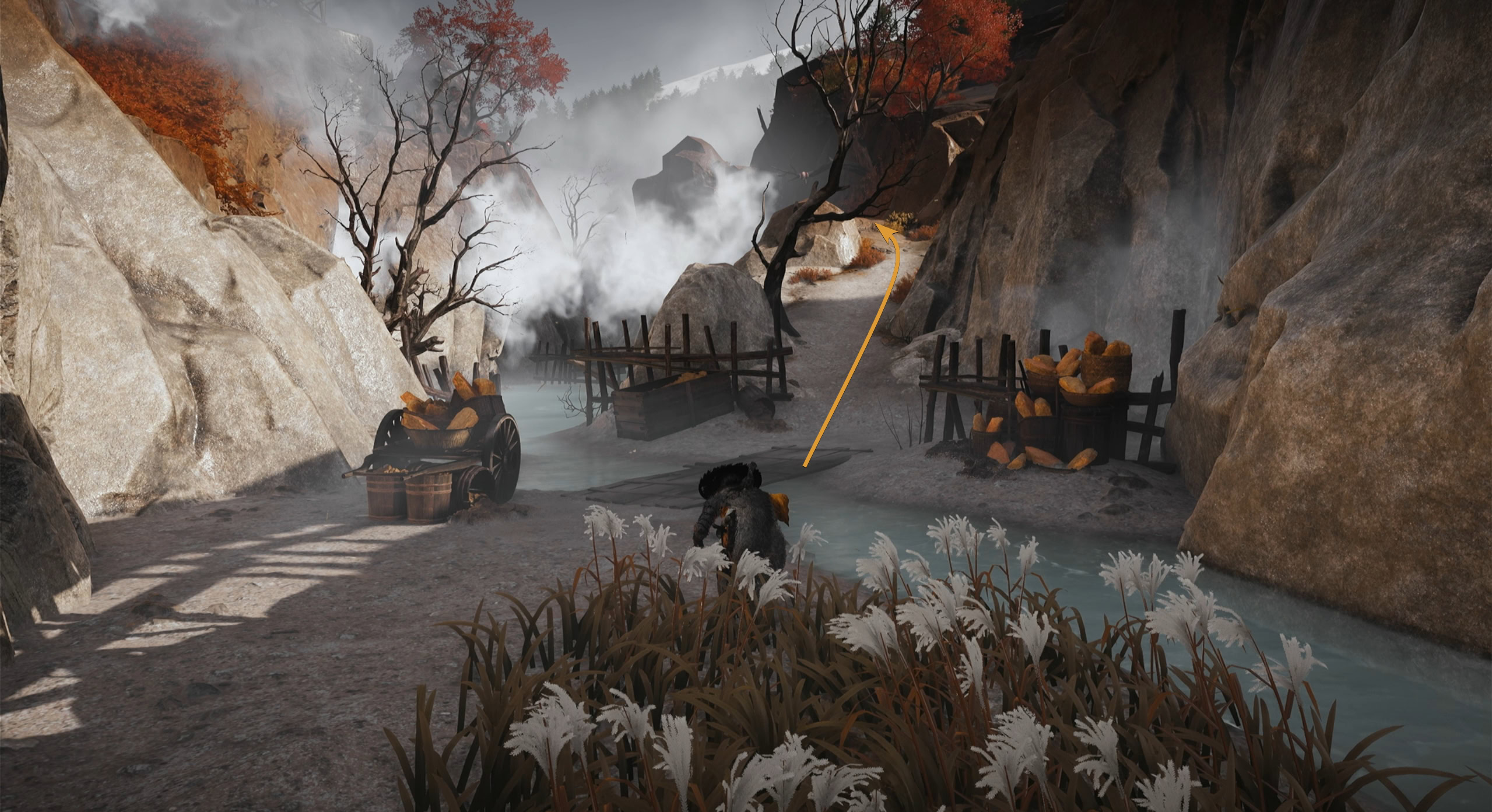 While you can reach the elevated platform, you’ll want to avoid this to prevent the Black Guard from spotting you. Instead, stay low and go through the tall grass under the bridge.
