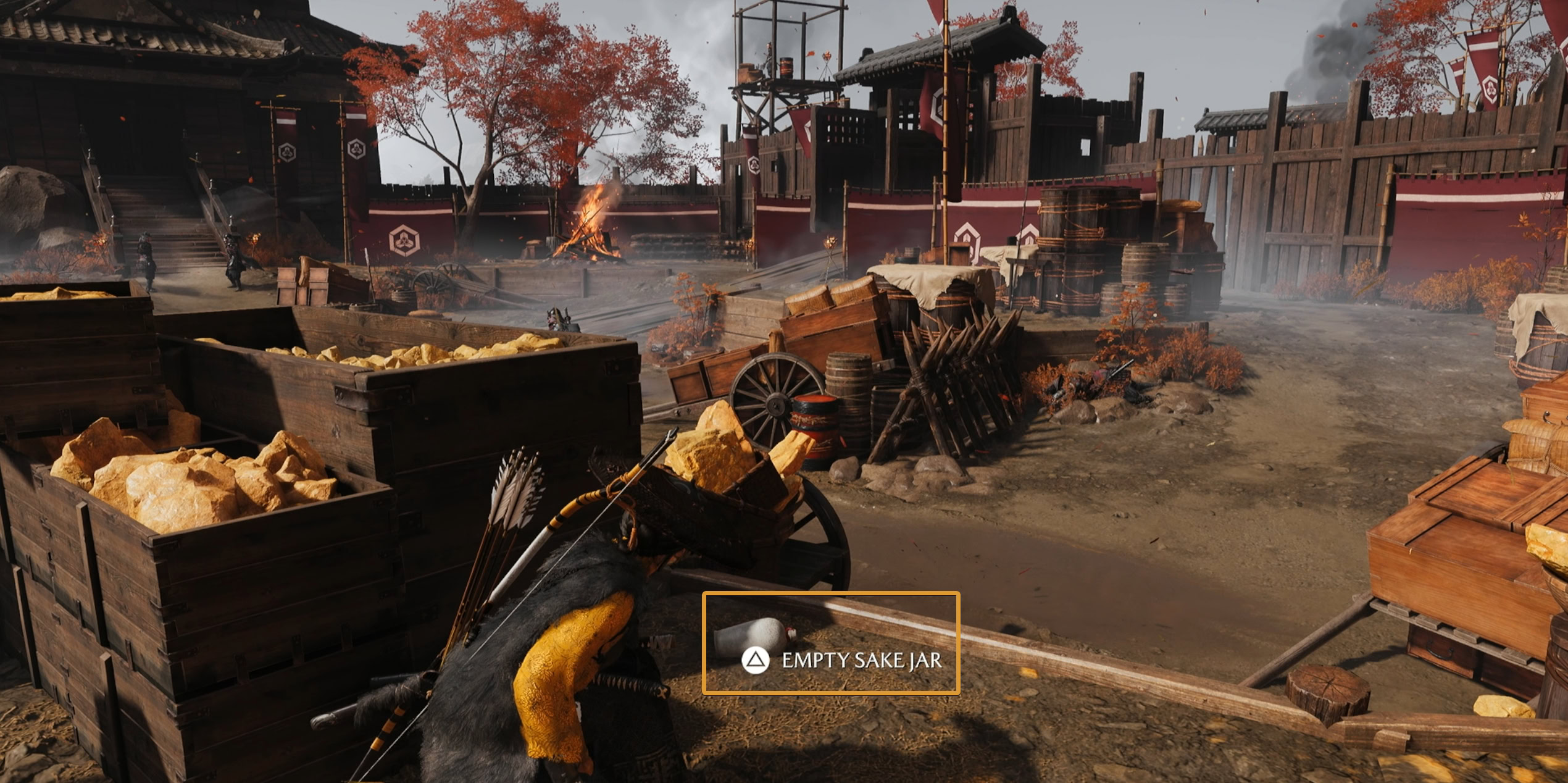 Look at your feet to find an empty sake bottle. Grab it and jump down the small ledge, then throw the sake jar to distract the soldier to your left. Once he turns around and walks away, run past the soldier you sniped earlier.