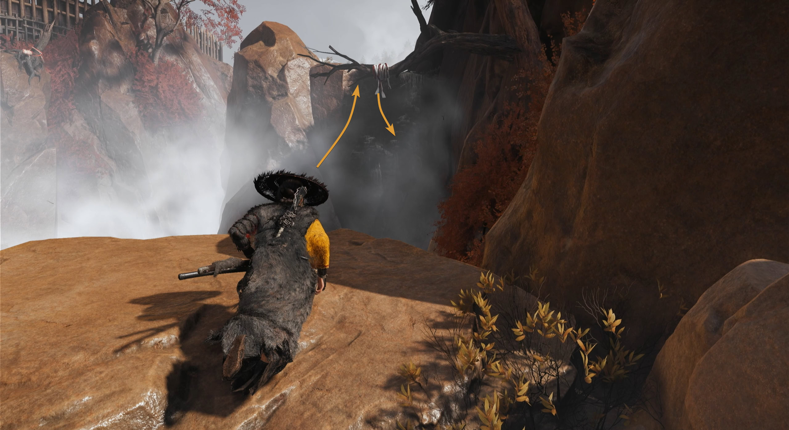 Proceed to jump off the ledge, grapple onto another tree branch, climb up, then go across the log that extends to Koga Fortress, and grapple onto the elevator platform.